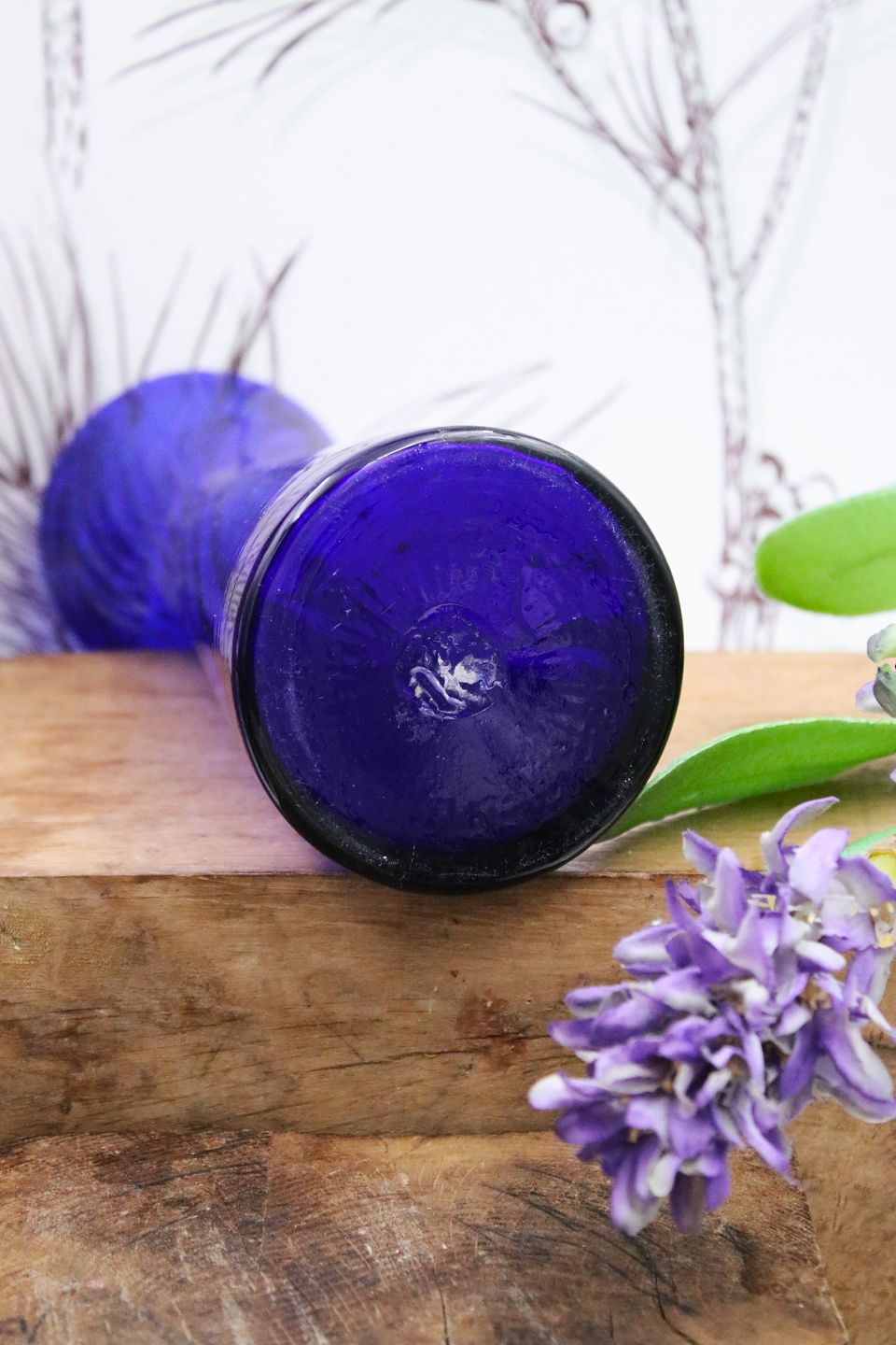 Antikt blåt hyacintglas i mundblæst glas fra Holmegaard glasværk. H: 21cm. Dia.: 7,5cm. (2 stk. haves på lager) Emne nummer: Hyacintglas Blåt