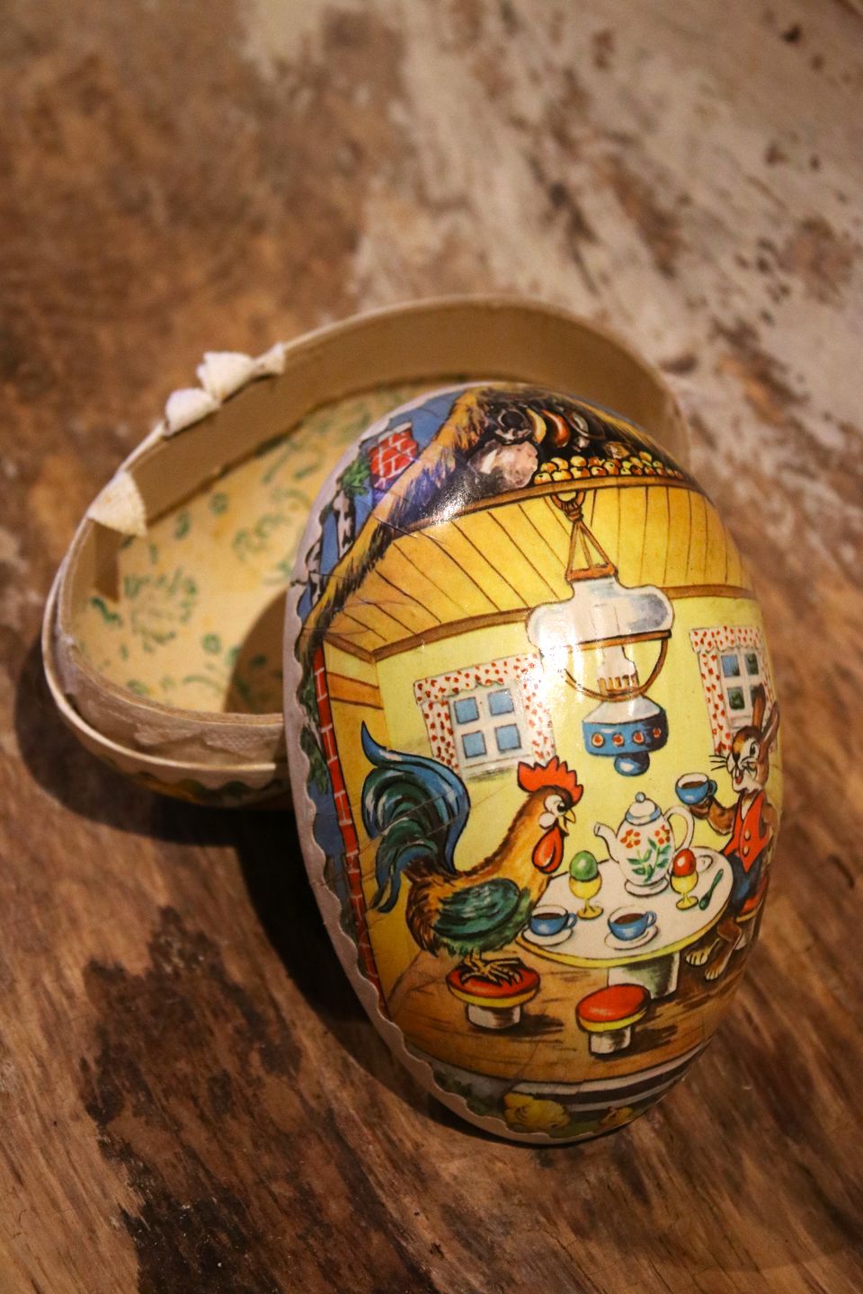 Gammelt vintage påskeæg i papmache med motiv af påskehare og høne der drikker te sammen. Højde: 12cm. Emne nummer: Påskeæg nr.2