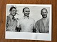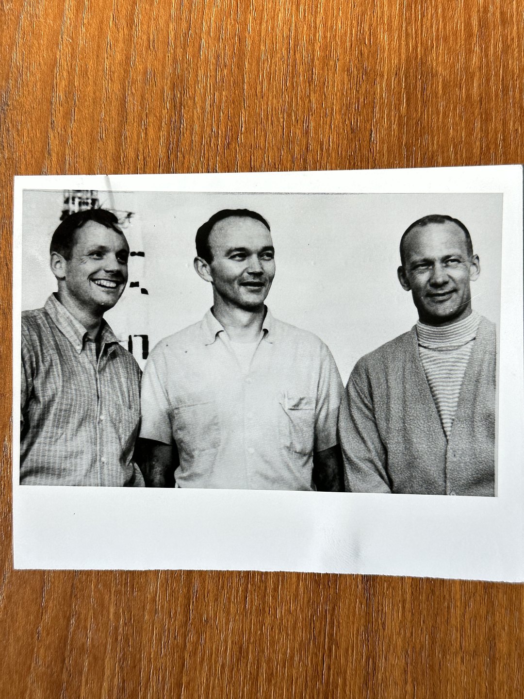 NASA: Small original black and white photograph of the three Apollo 11 astronauts Neil Armstrong, Mike Collins and Edwin Aldrin, gelatin silver, July 1969 with the Apollo V rocket in the background