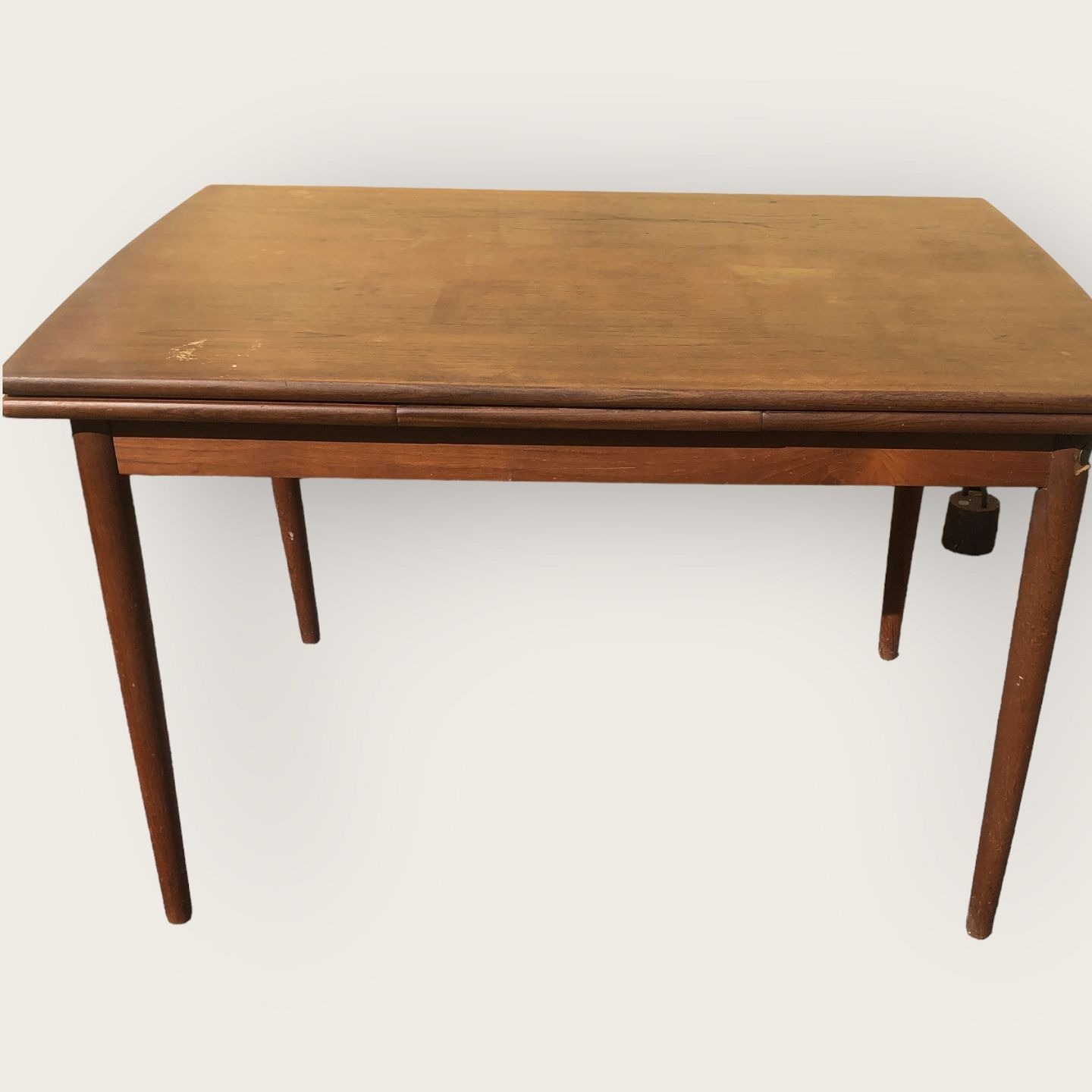 Description: Dining table in teak veneer. Danish modern from the 1960s. Has traces of use and a leg that has been repaired with a through screw (see photo). Dimensions: HxWxW 75x116(192)x76 cm