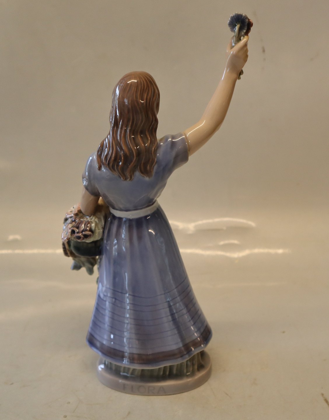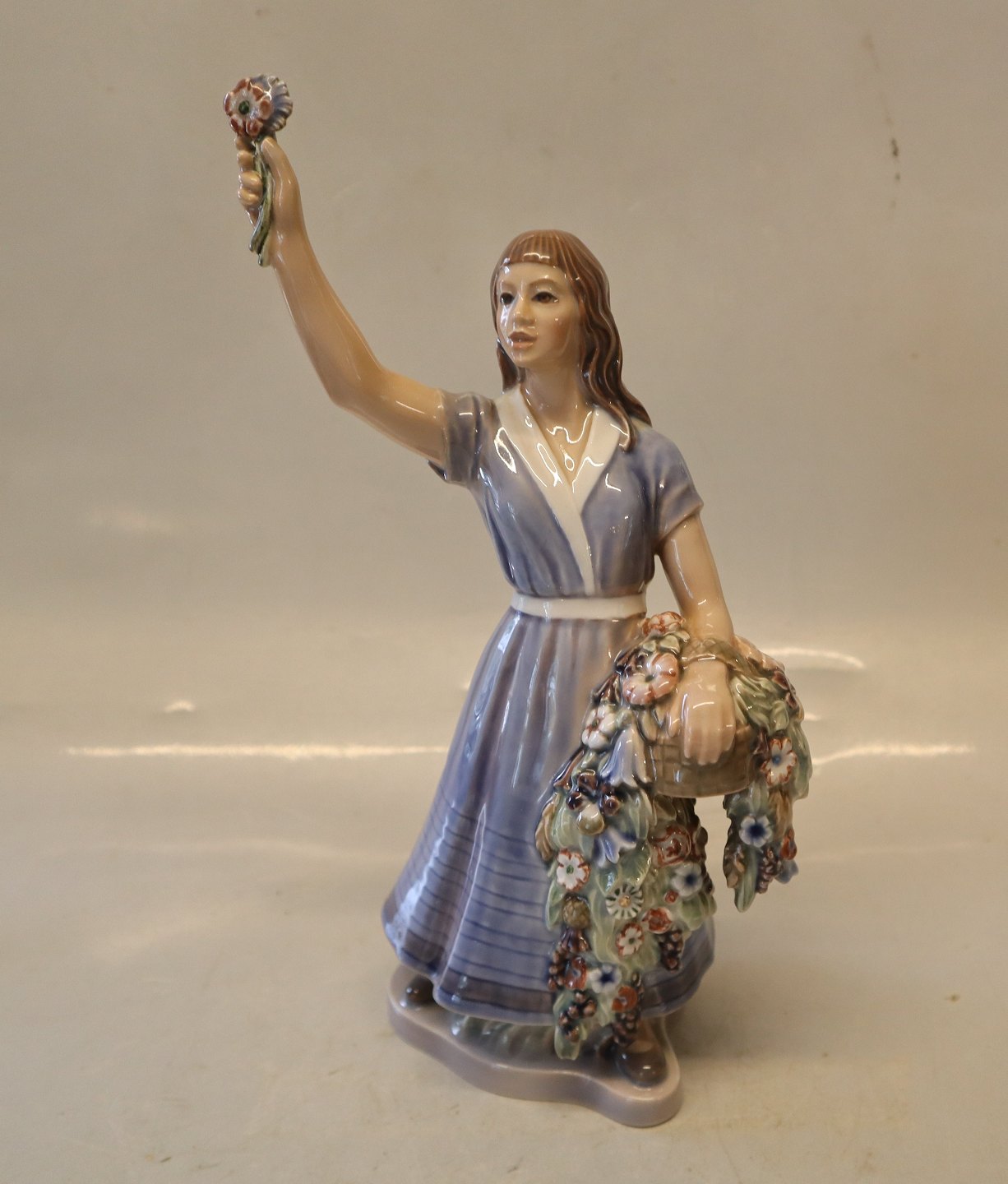 Description: Dahl Jensen 1309 Flora 25.5 cm (DJ) Girl with flowers Marked with the Royal Crown and DJ Copenhagen. In nice and mint condition Dahl Jensen Worked first for Bing & Groendahl B&G from 1897