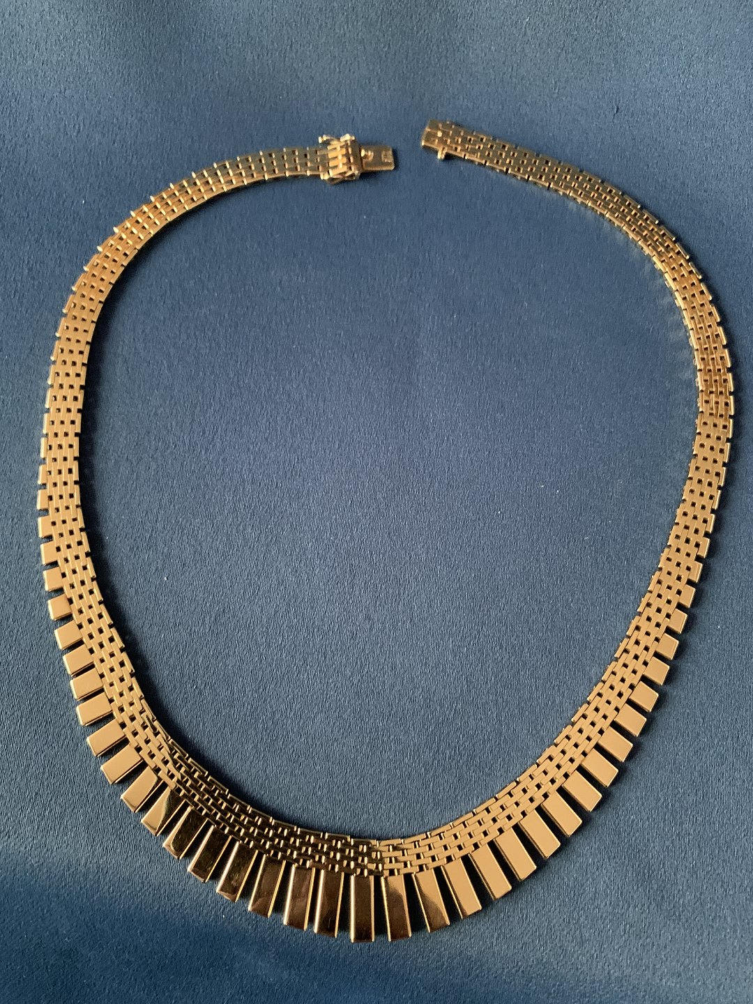Necklace in 14 carat gold, bricks in 7 rows, with process, stamped 585 JTH. Length 41 cm.