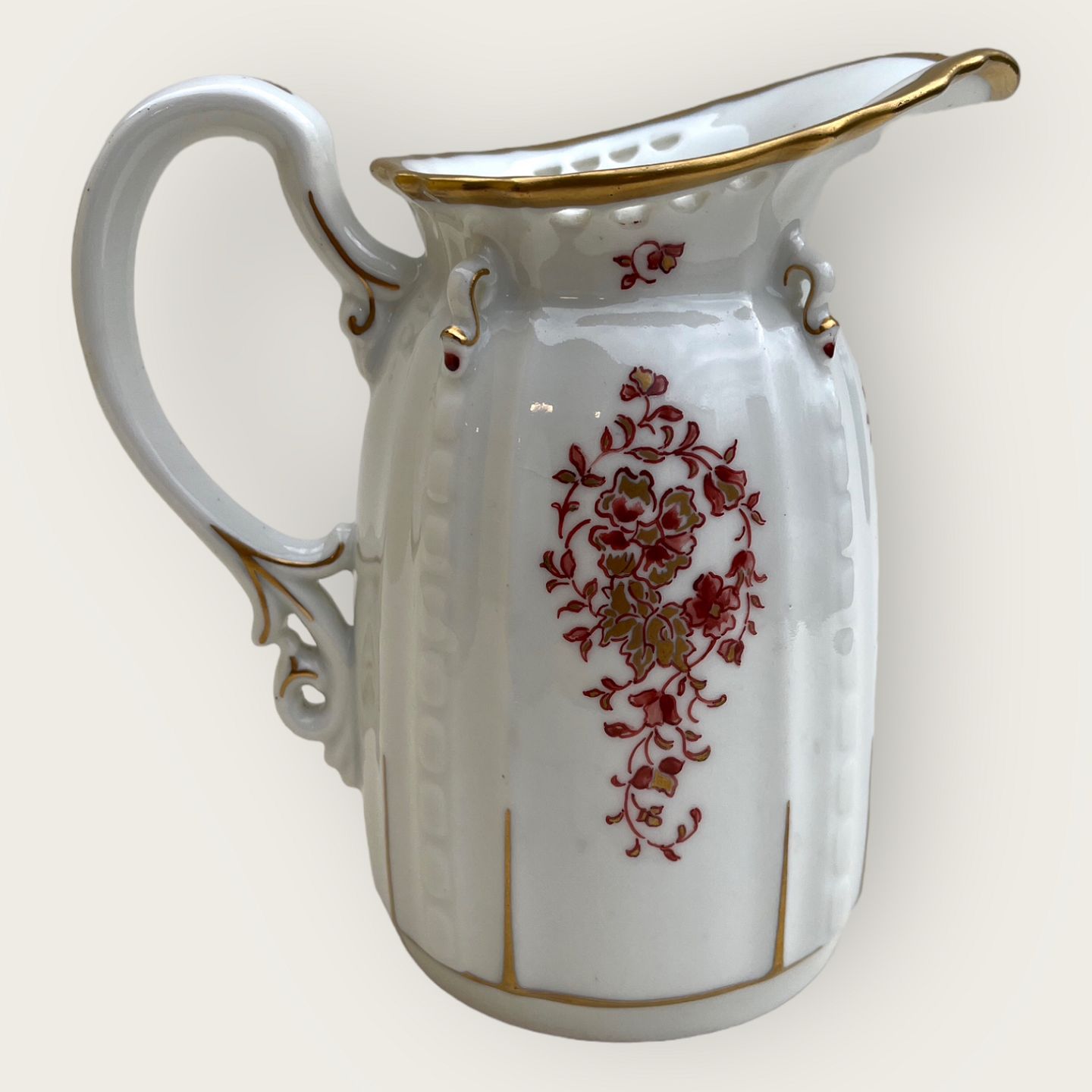 Description: Dahl Jensen, Queen, Jug, 19cm high, 18.5cm wide *Nice condition but with an unevenness on the gold edge*