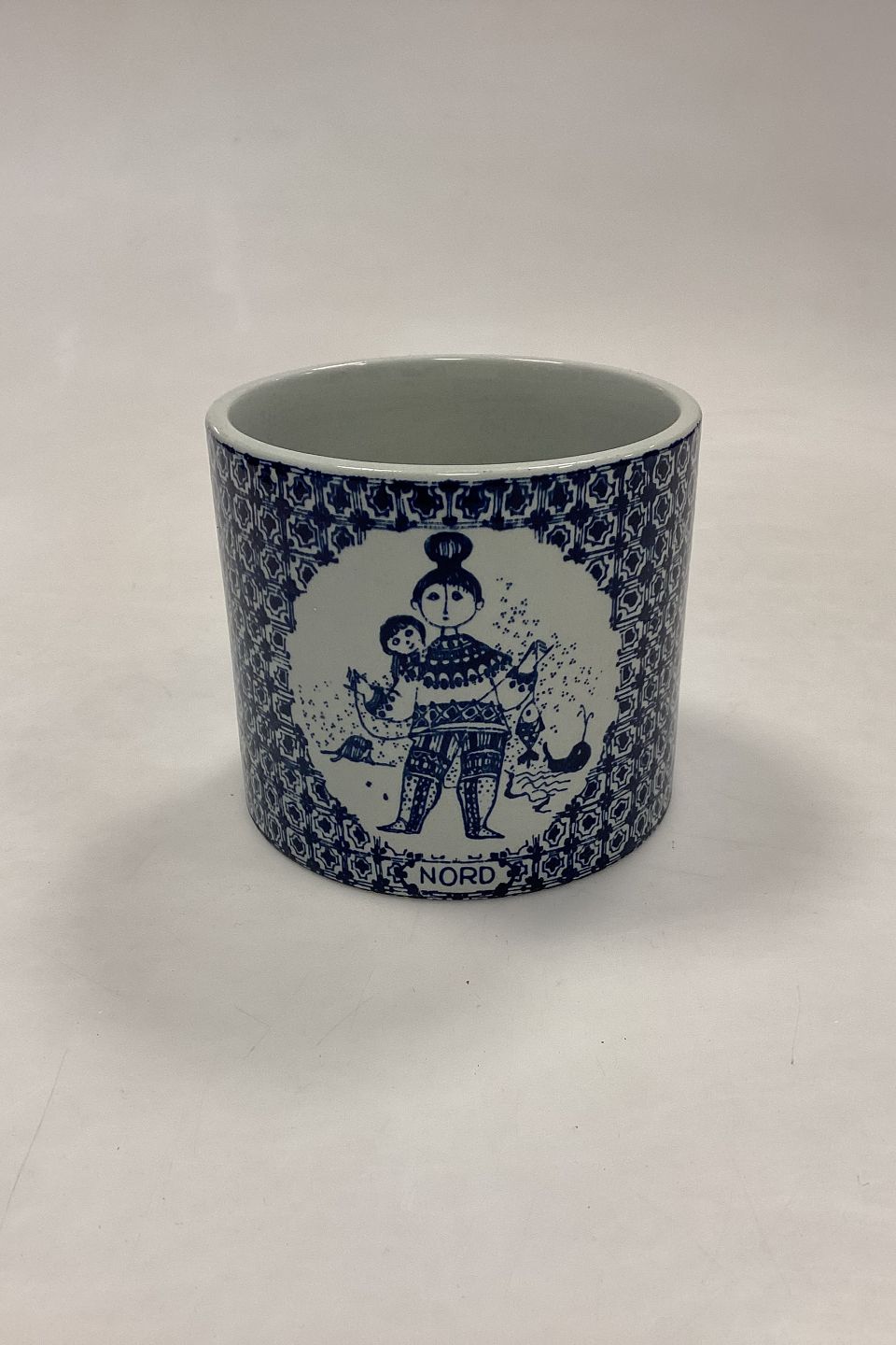 Description: Bjørn Wiinblad Nymølle Flower Pot - NORD No. 3022-697. Blue decoration. Measures 9.5 cm x 10.5 cm / 3.75 in. x 4.14 in.