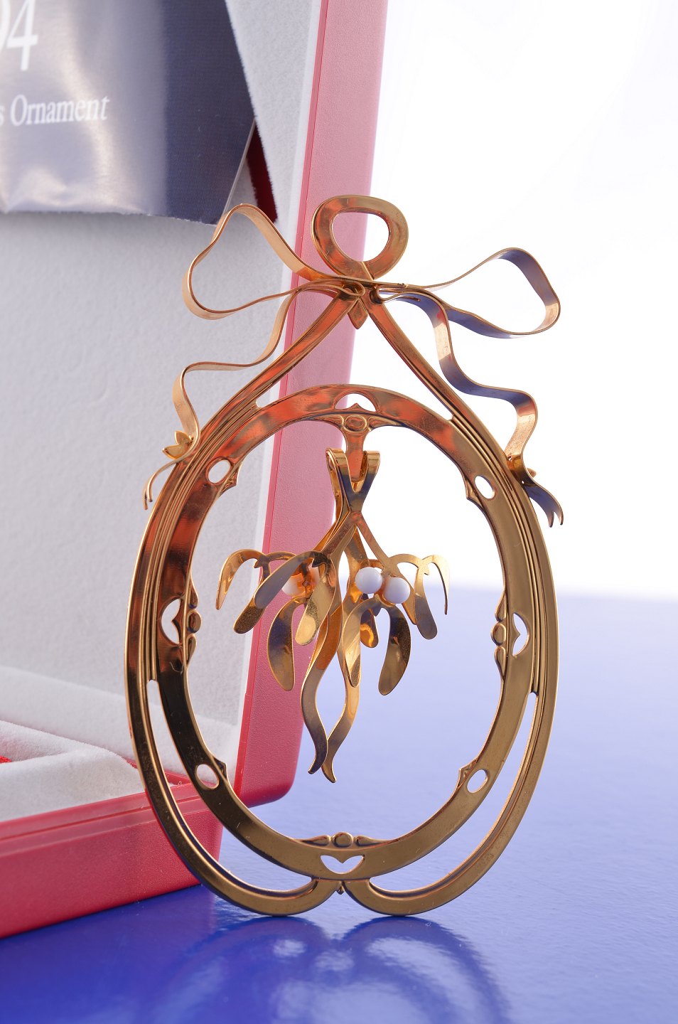 Description: Mistletoe, Christmas Mobile, 1994, The Christmas Ornament from Georg Jensen. Gilded brass. Design : Jette Frölicb. Fine condition, with box.