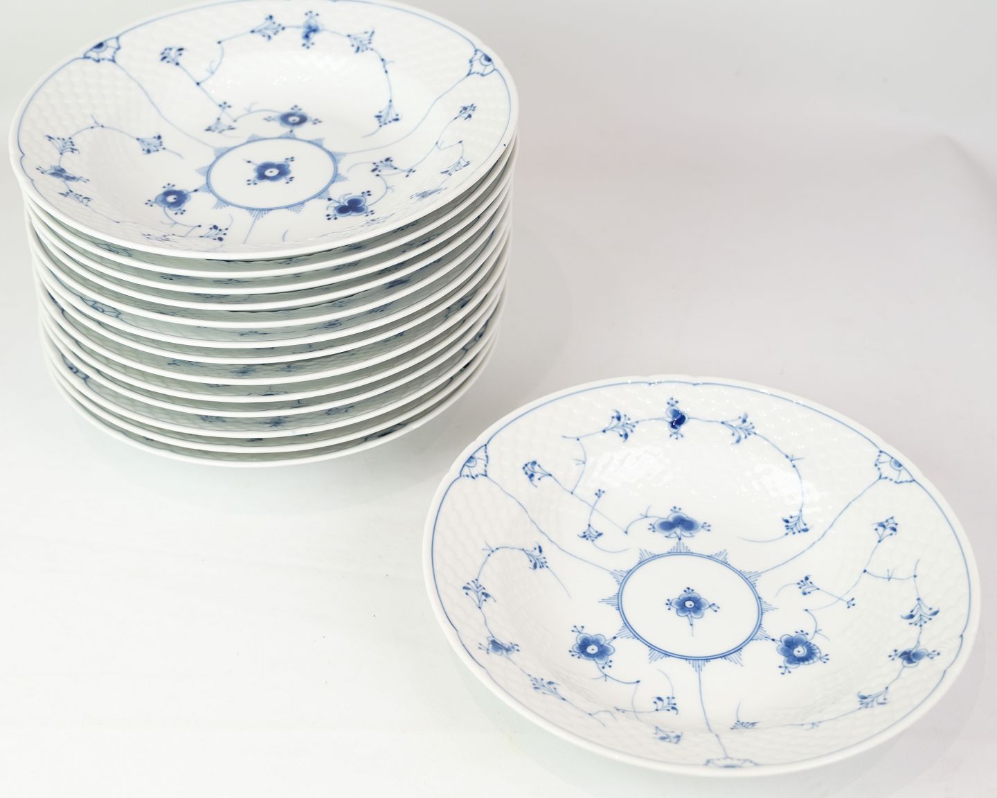 Description: Deep Plate No. 22 from Bing & Grondahl. Made of porcelain with classic blue painted blue fluting decoration.