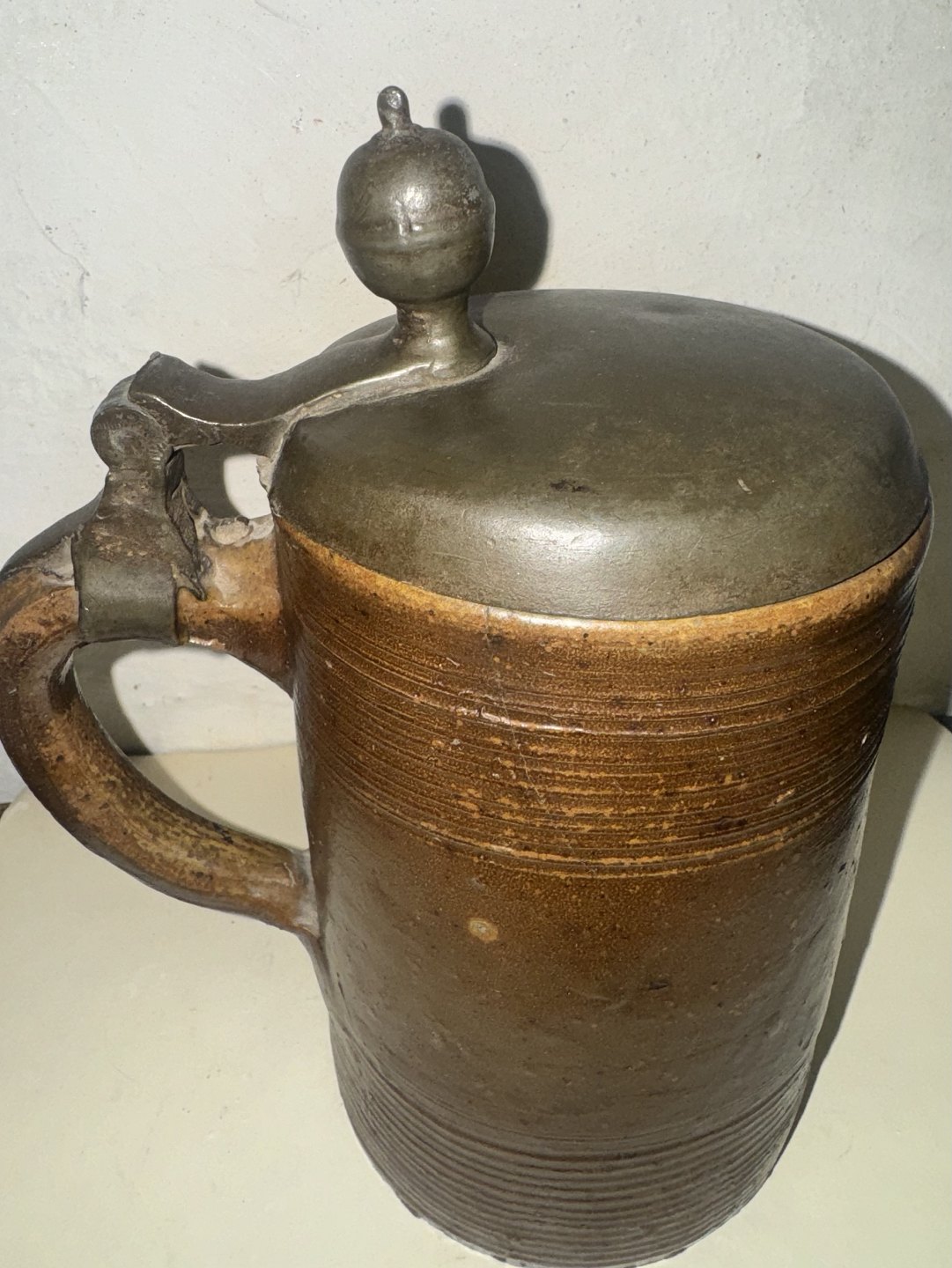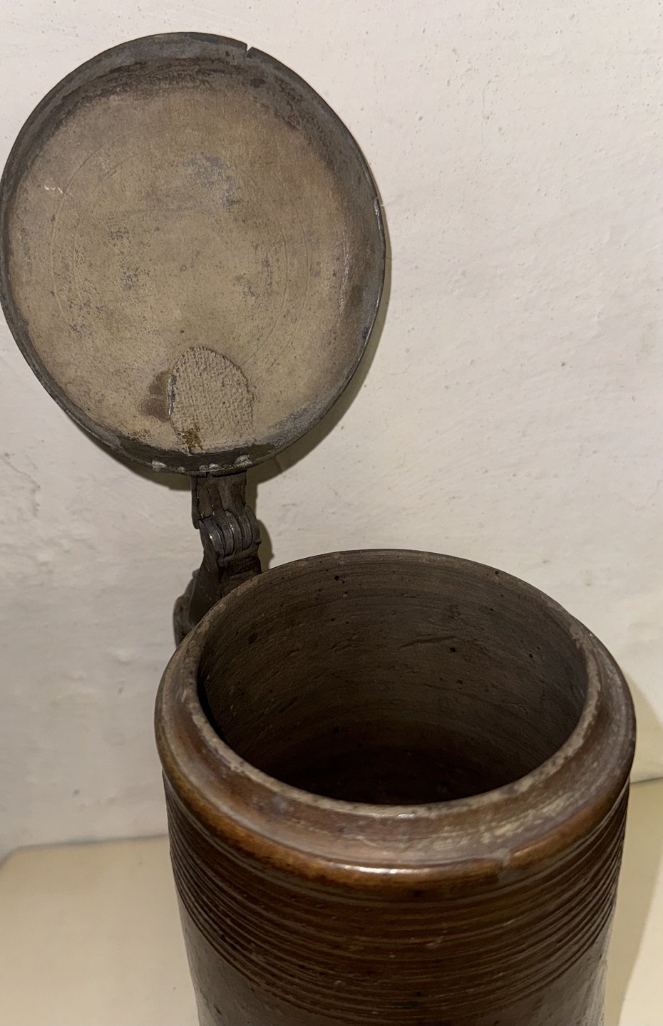 Description: Ceramic mug with metal lid. Made in Germany in the first half of the 19th century. The mug has some signs of wear (see photos with the gray arrows). Measures: 15.5 cm and 21.5 cm included the top of the lid.