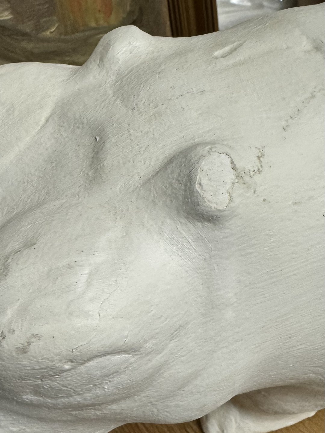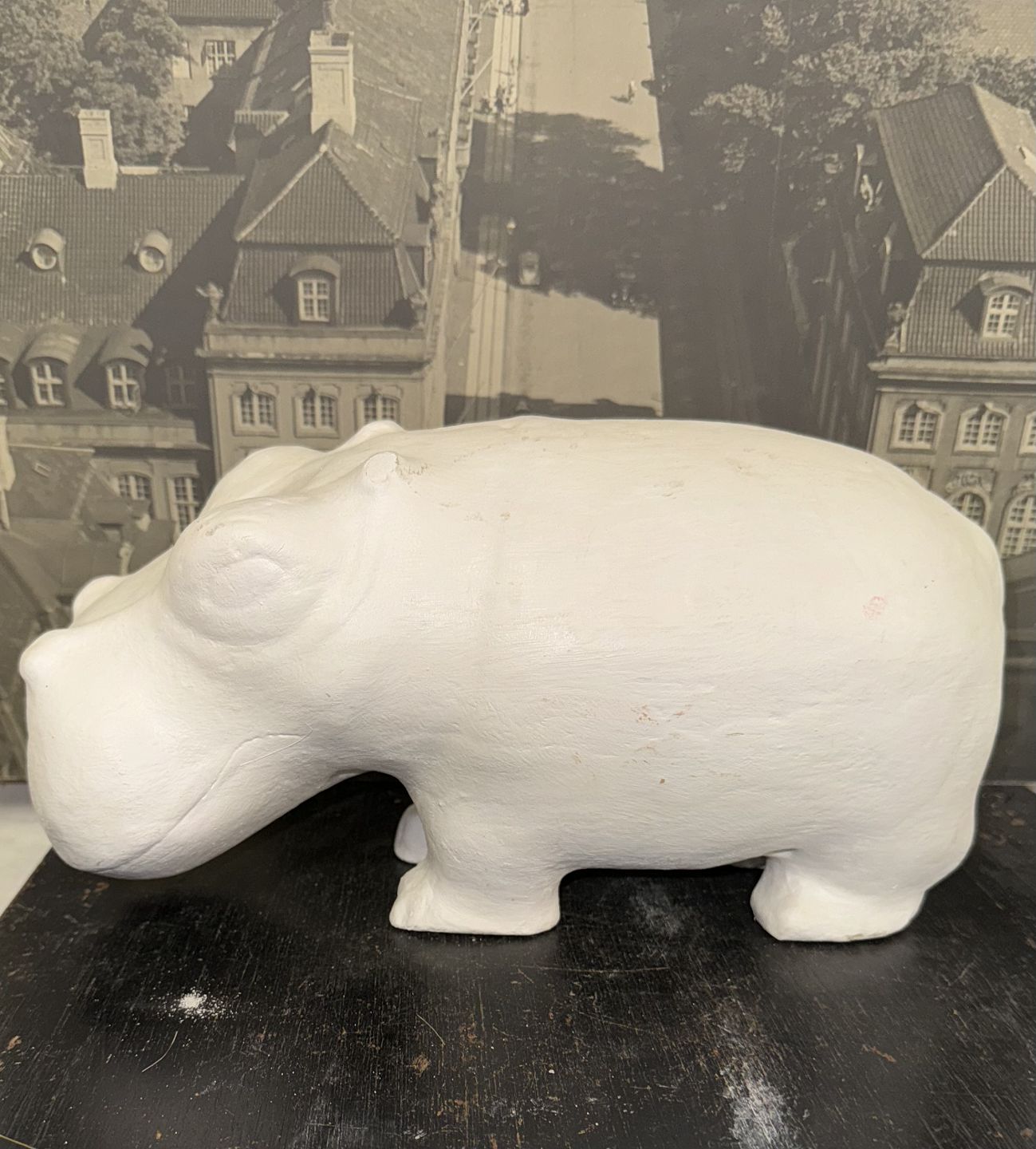 Beskrivelse: Stor figur af flodhest udført i ubemalet gips. Fremstår i god stand med få overflade brugsspor. Formodes fremstillet for Ny Carlsberg Glyptoteket i København. Figuren er formentlig en museums-kopi af flodhest i sten, der tilhører museets samling. Den oprindelige figur er cirka i samme størrelse og udført i keramik. Lignende figurer ses på museer rundt i verden. Nogle farvede andre uden farve. I oldtidens Egypten blev lignende flodhestestatuetter ofte placeret i grave for at beskytte den afdøde i efterlivet eller i hjem for at beskytte familien. I dag forventes figuren dog hovedsageligt at blive brugt som et dekorativt objekt i den private bolig. Mål: H. 14 cm, B. 12,5 cm og L. 29,5 cm.