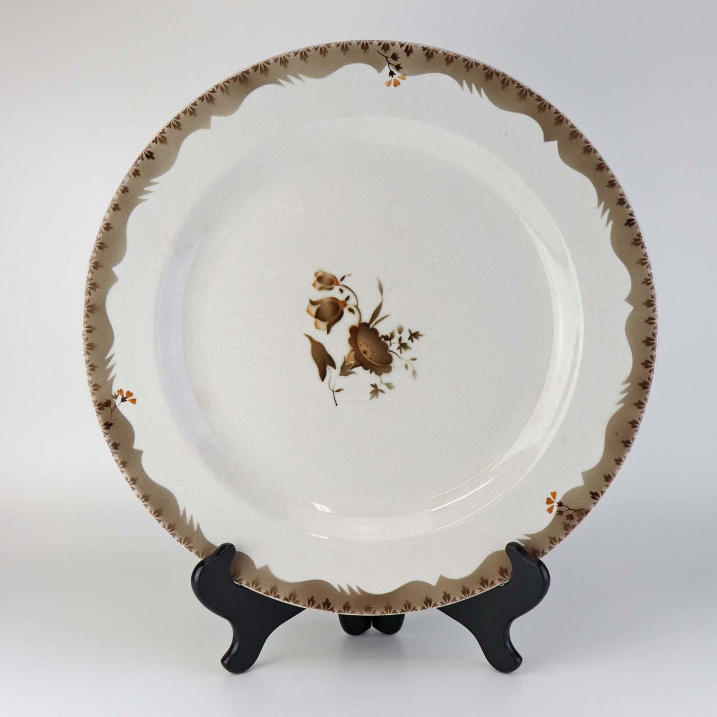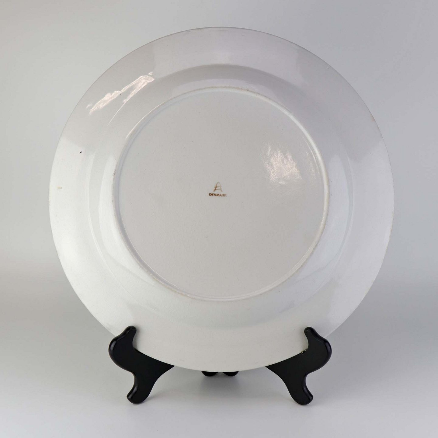 Fremstår med krakkeleringer i glasuren og mørkninger under glasuren samt på fadets kant på undersiden.