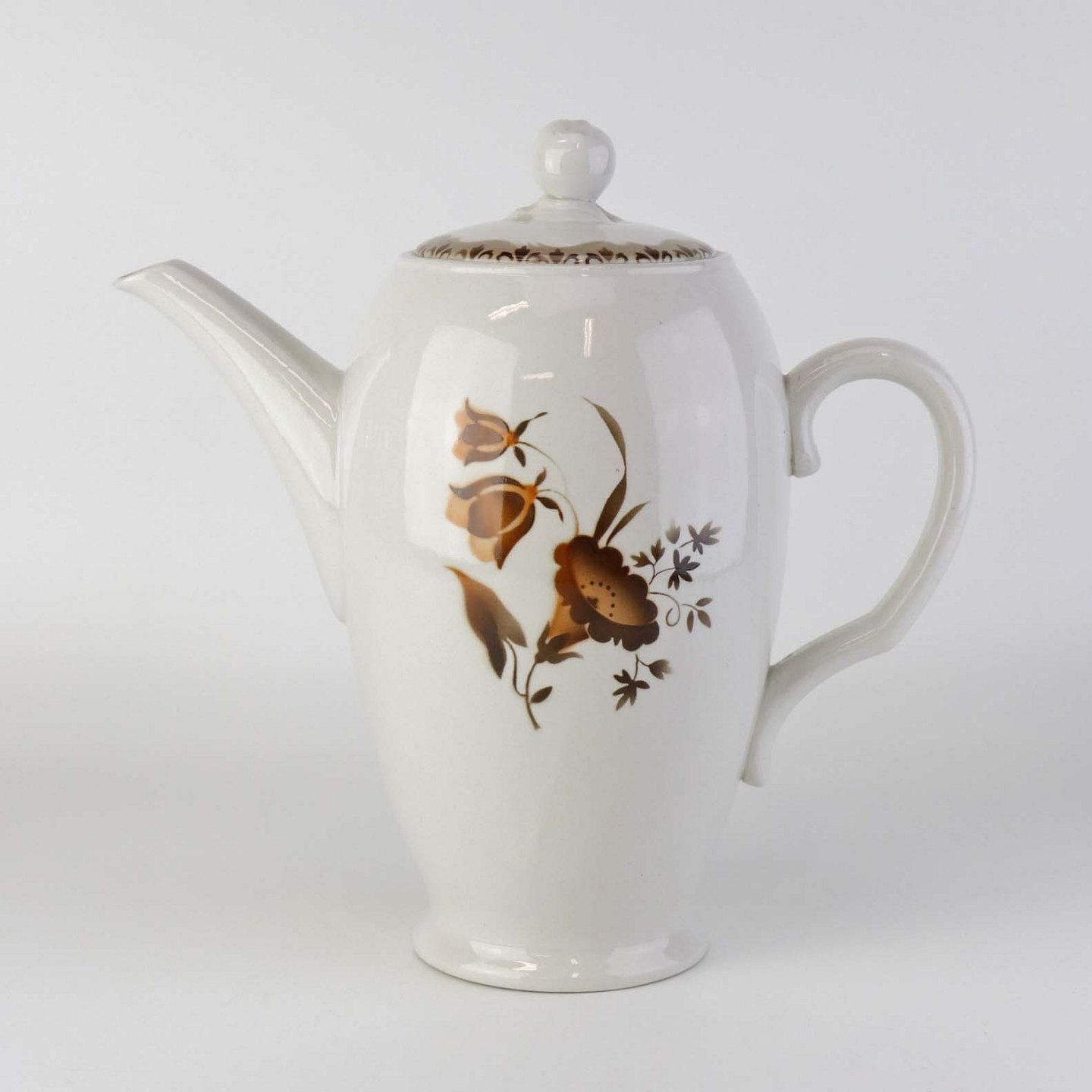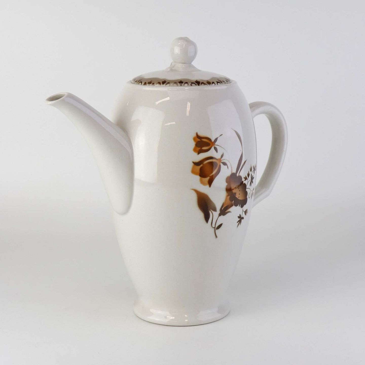Stel i glat hvid fajance i stelform C med dekoration af brune snerleblomster og lysebrun kant med bladmotiv. Stellet blev produceret i perioden år 1930-1941