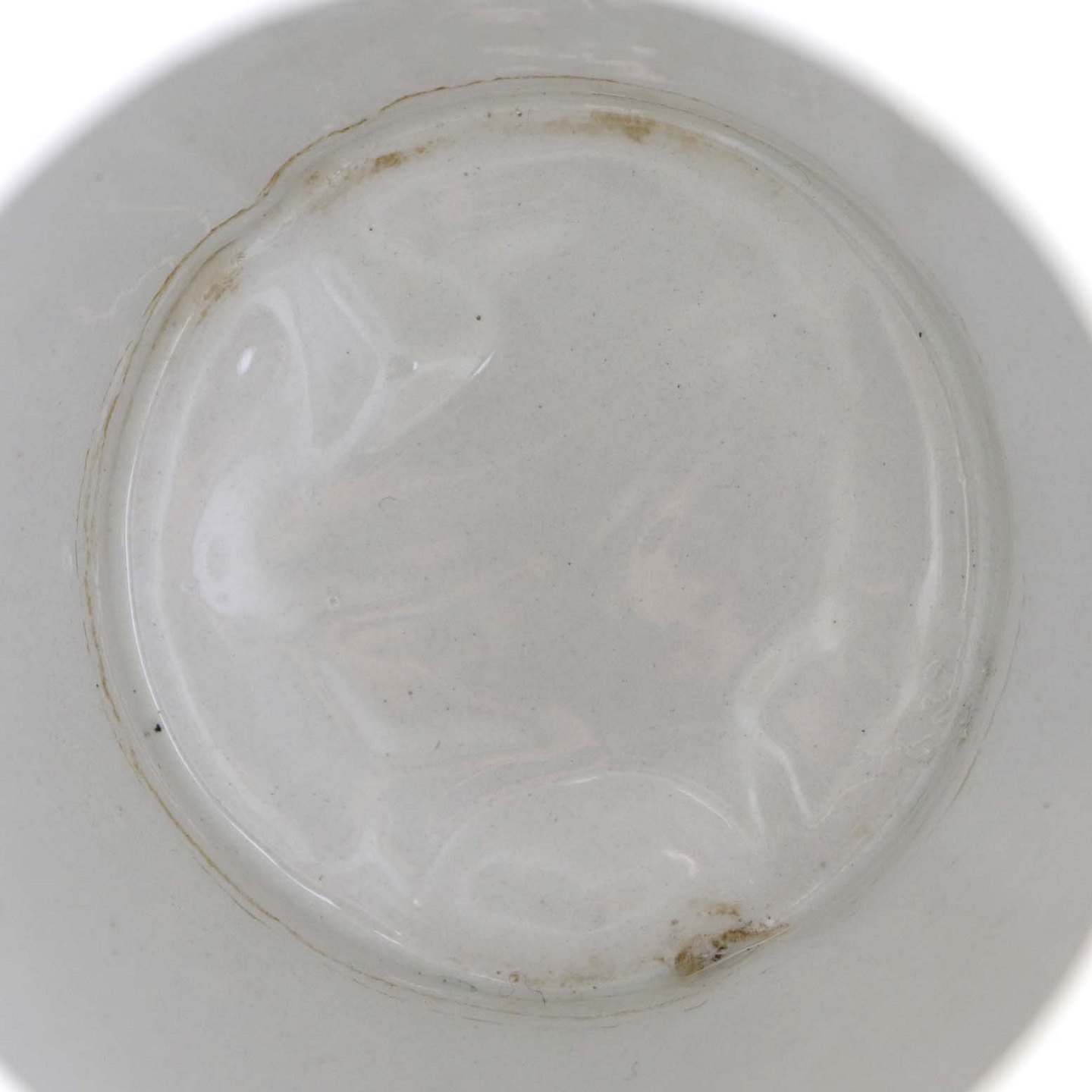 Fremstår med indvendige brugsspor, mindre slid på glasuren på tuden, utydelig grønlig streg under glasuren på låget, ujævnhed i topkanten og brugsspor under bunden.