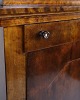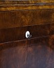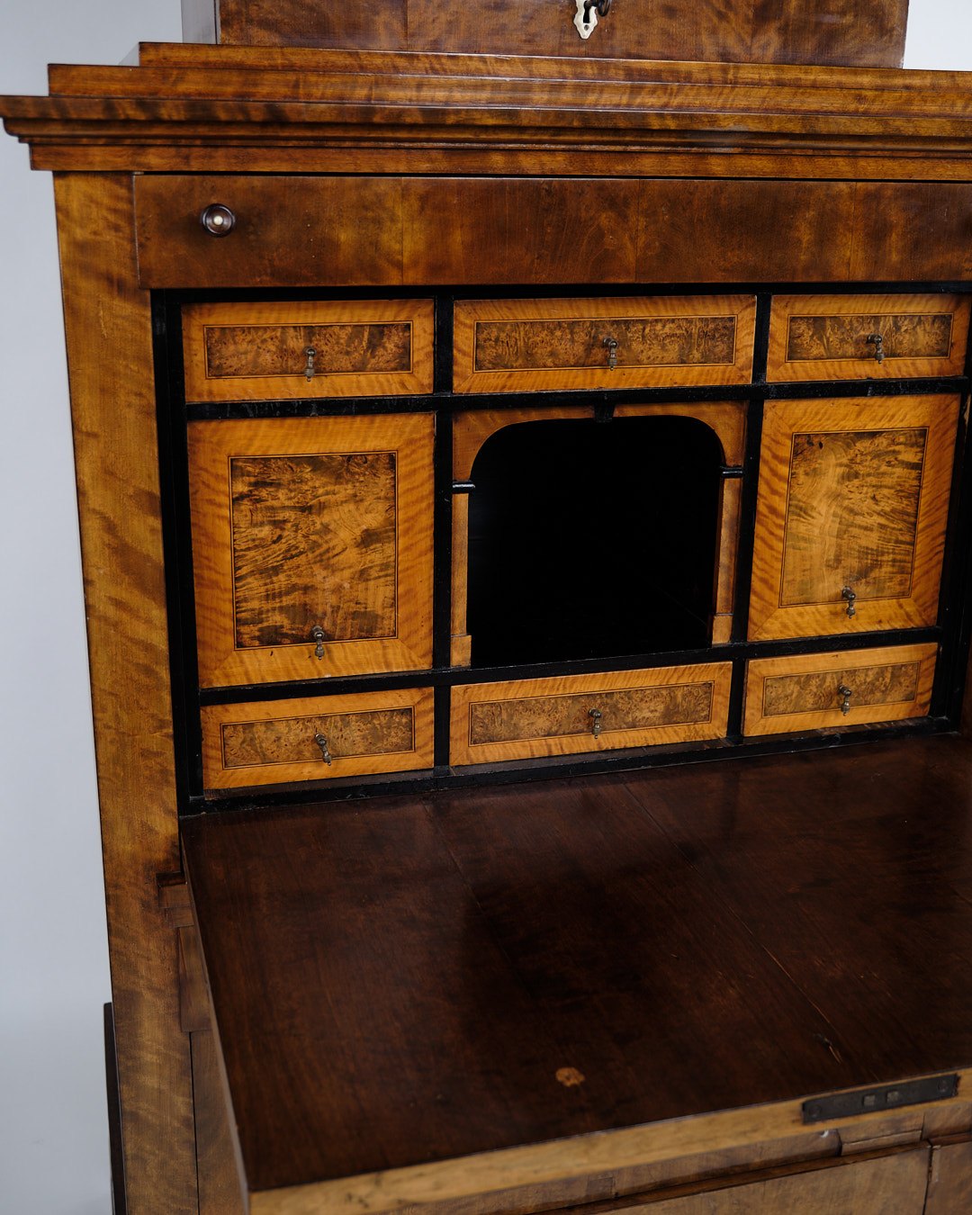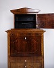Beskrivelse: antik sekretær fra 1840’erne, udført i håndpoleret birketræ med smukke intarsia-detaljer. Møblet er indrettet med to skuffer og fremstår som et fint eksempel på 1800-tallets klassiske snedkerhåndværk, hvor funktionalitet og dekorativt udtryk blev forenet.