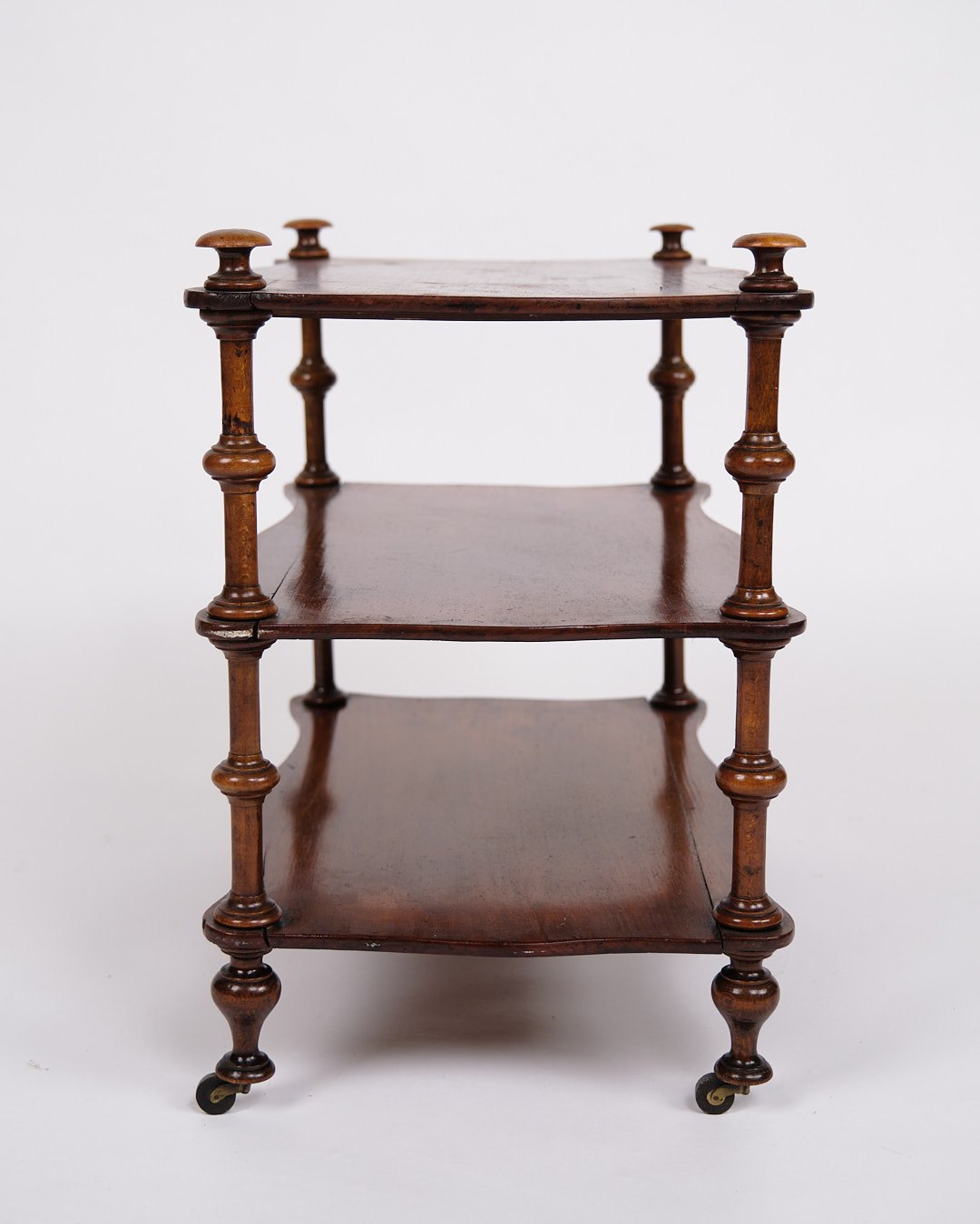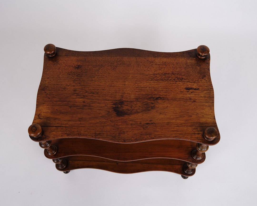 Beskrivelse: etagere/reol fra 1800-tallet, udført i mahogni. Møblet er indrettet med tre hylder og detaljerede drejede søjler. Nederst er det monteret med små hjul, hvilket giver både funktionalitet og mobilitet.