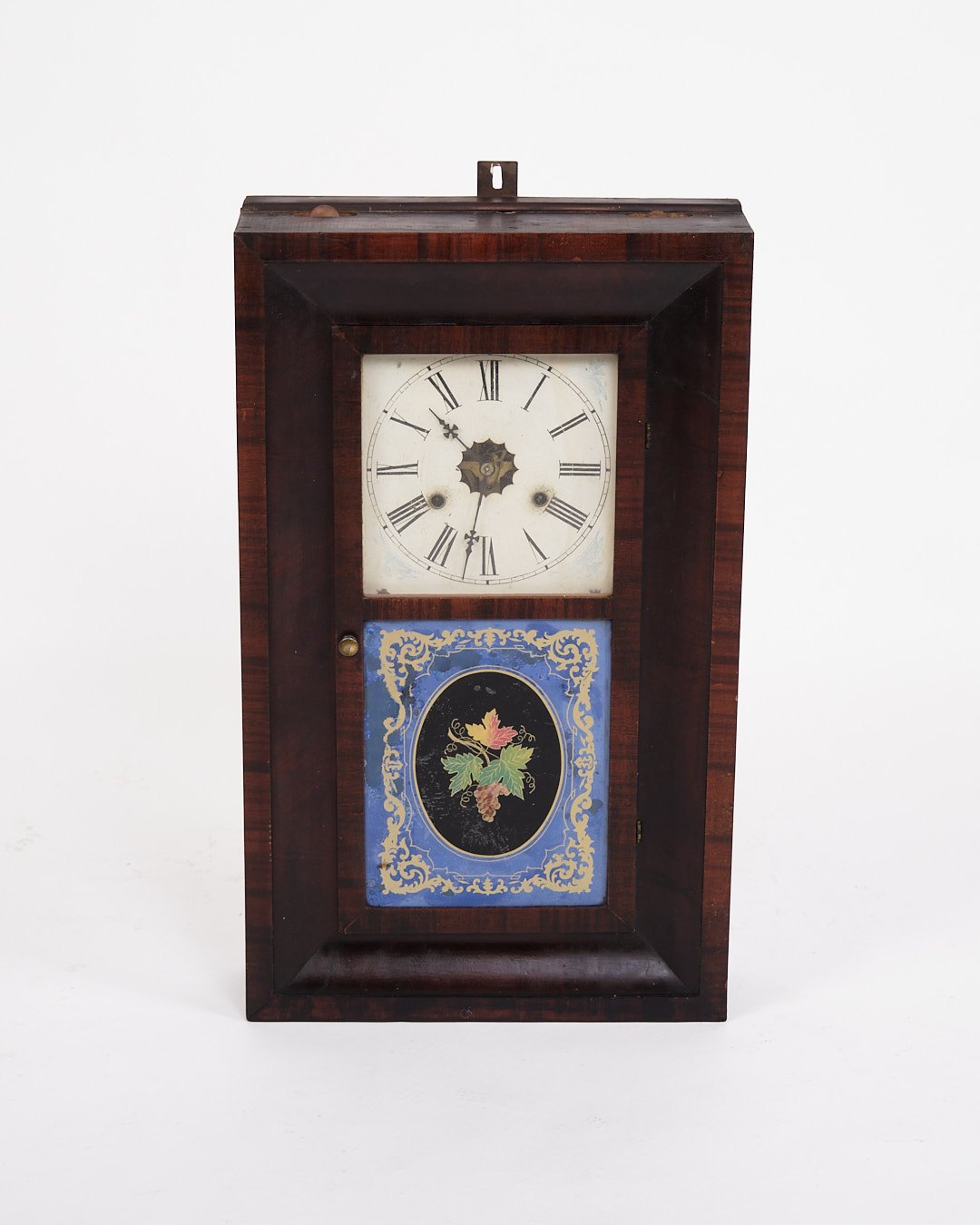 Beskrivelse: Dekorativt amerikanerur fra 1800-tallet, udført i mørkt træ. Uret har en klassisk urskive med romertal og en bemalet glasrude, der giver et charmerende og tidstypisk udtryk.