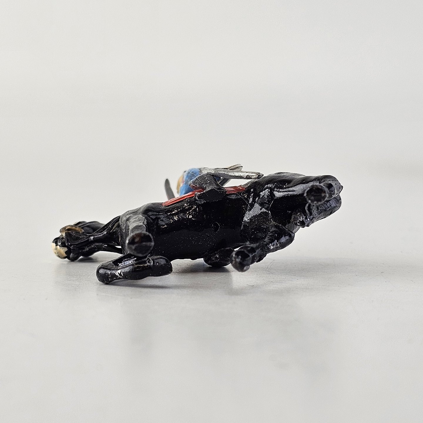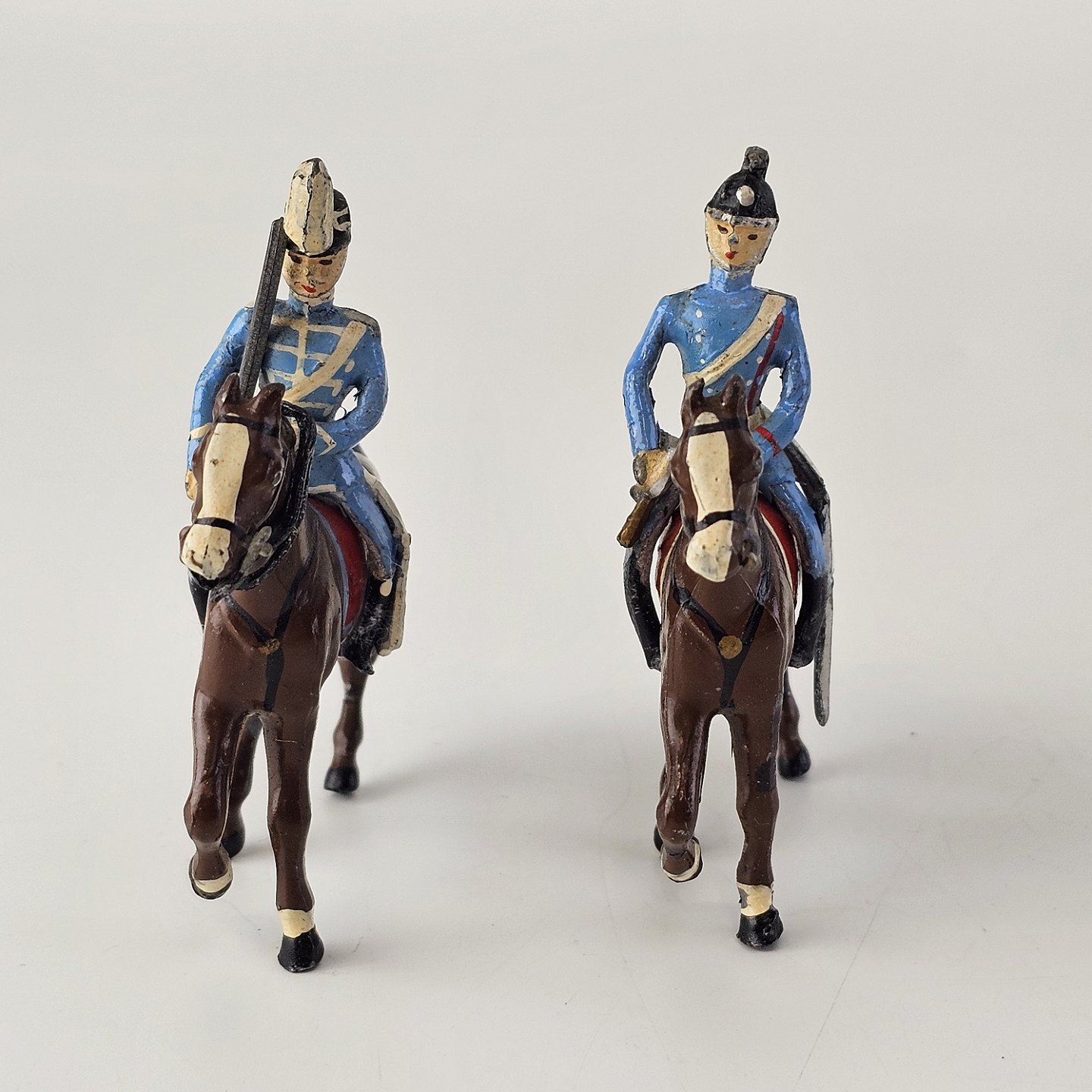 Beskrivelse: 13 figurer af dragoner på heste i tin. Seks brune heste og syv sorte heste, to dragoner rider med flag og ni med sabler, og en løs fane