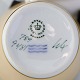 Service i glat hvid porcelæn med sandfarvet dekoration og gylden kant.