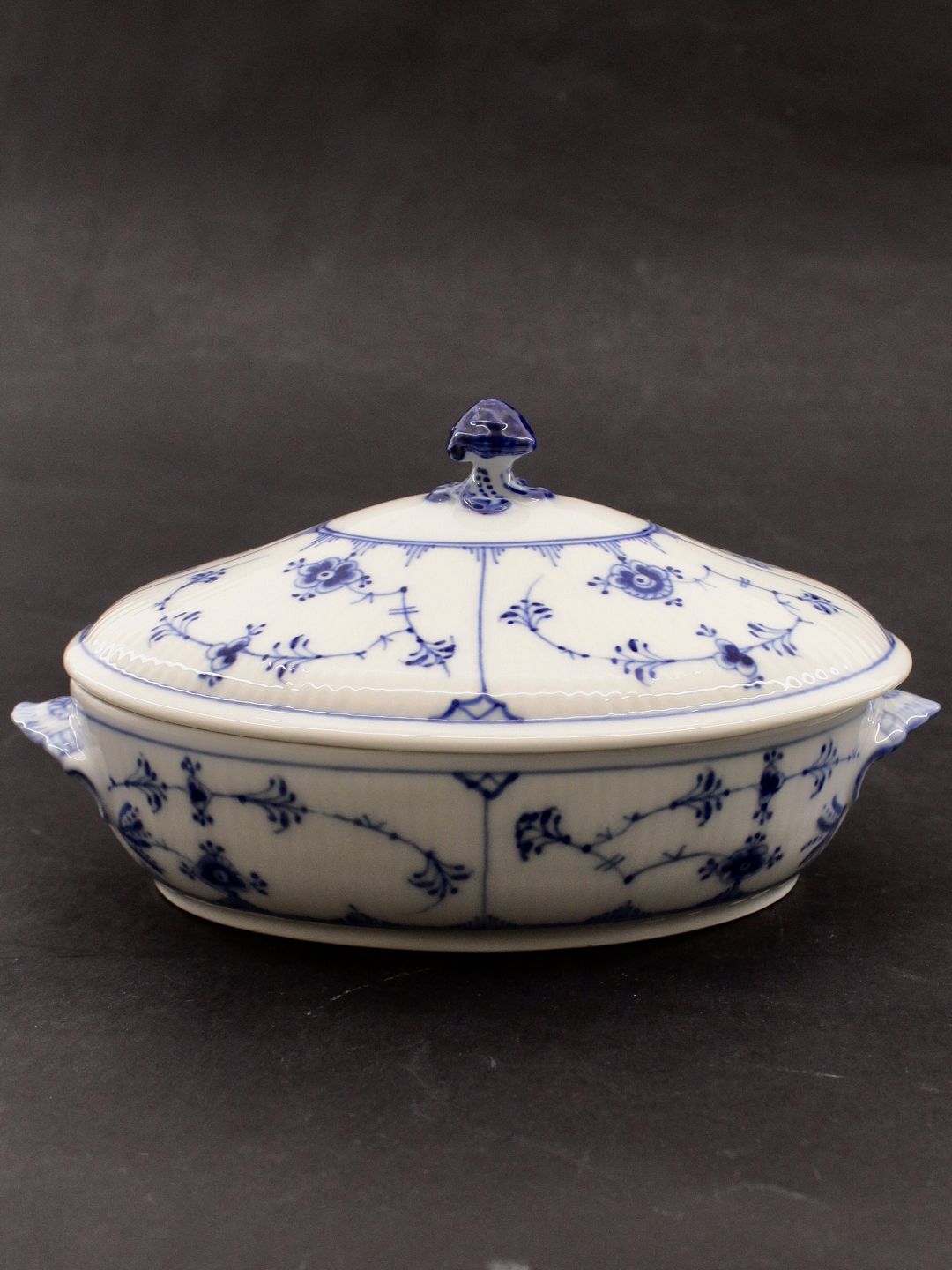 Beskrivelse: Royal Copenhagen Musselmalet Riflet oval Terrin Nr. 405 1.sortering emne nr. 622248