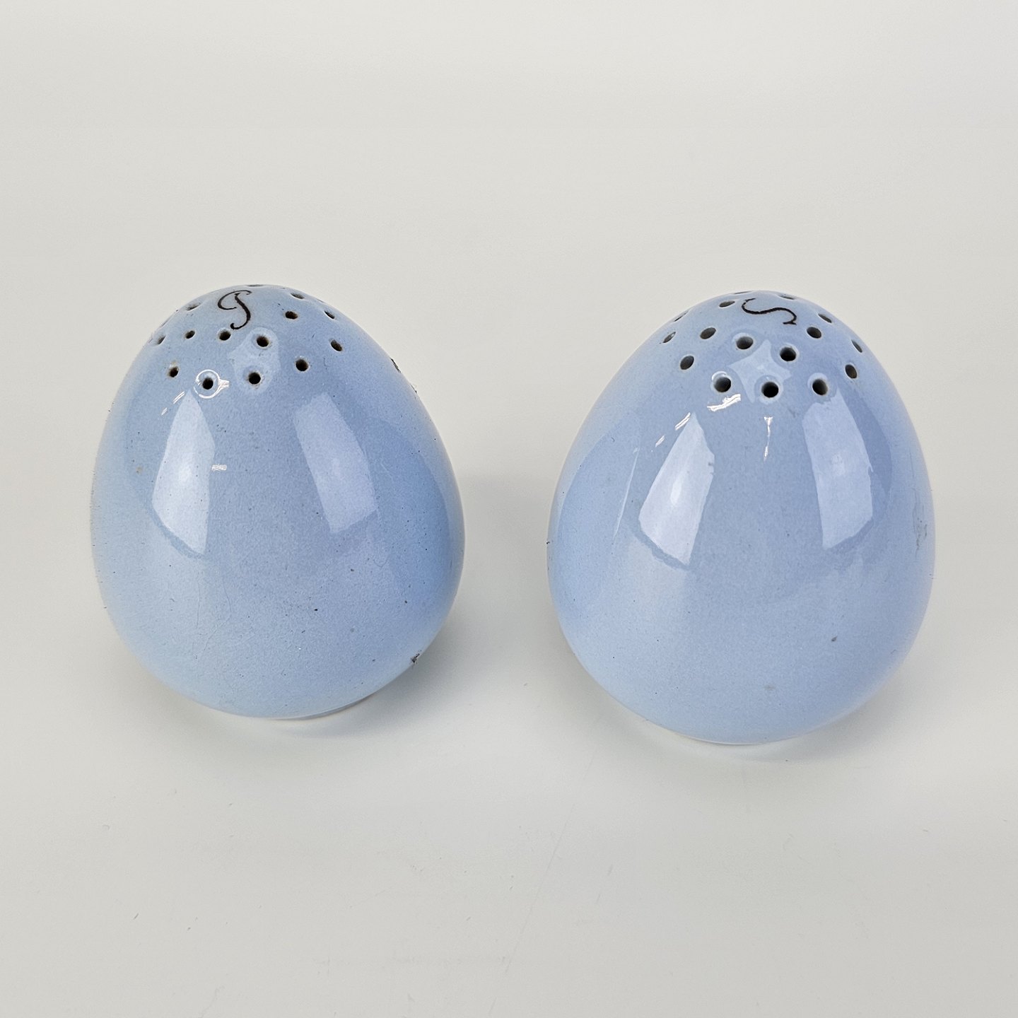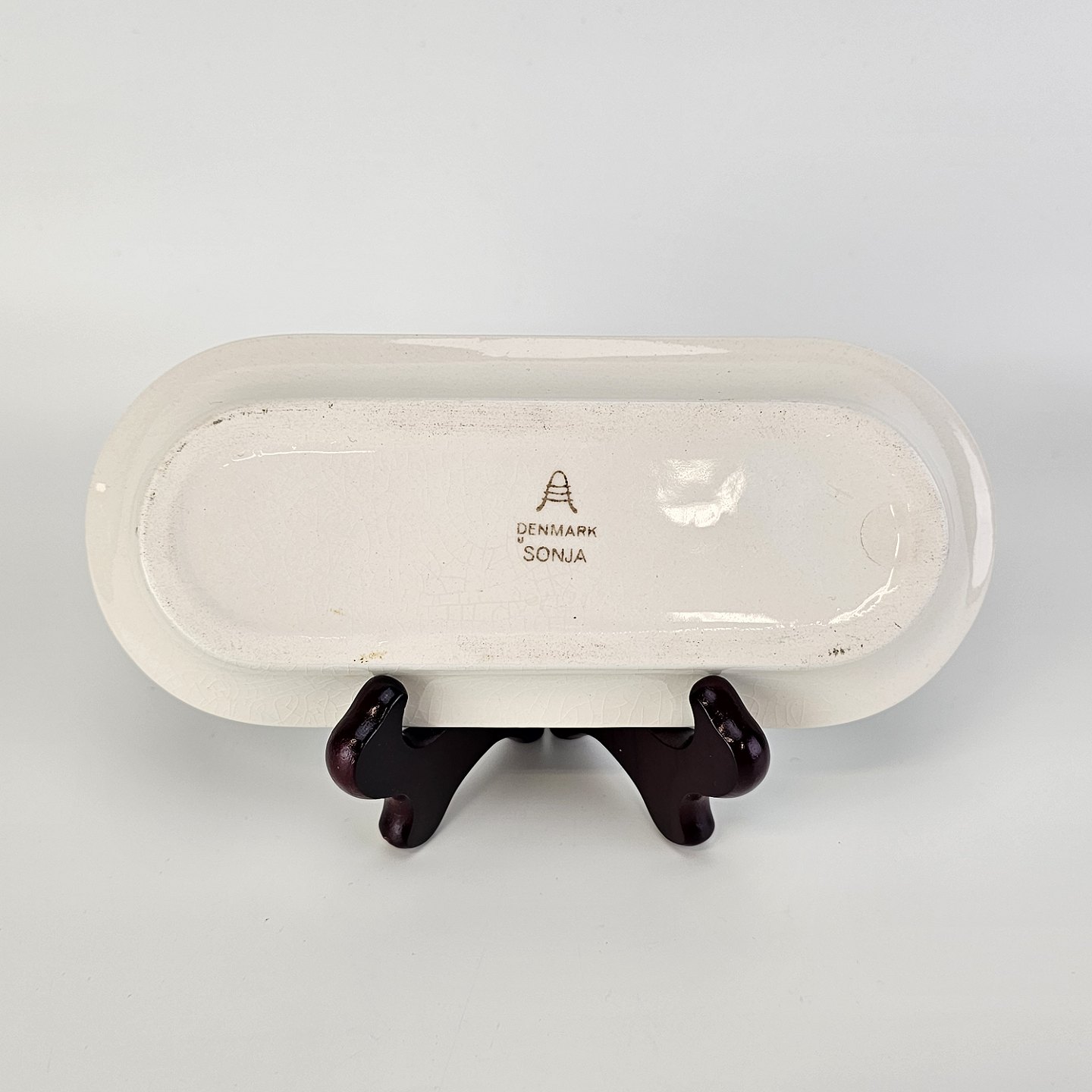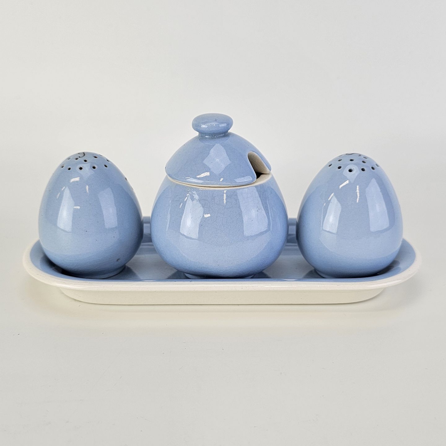 Beskrivelse: Salt, peber og senneps sæt på tallerken i fajance fra stellet Sonja