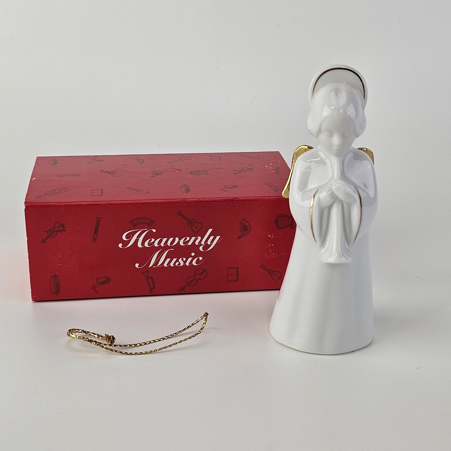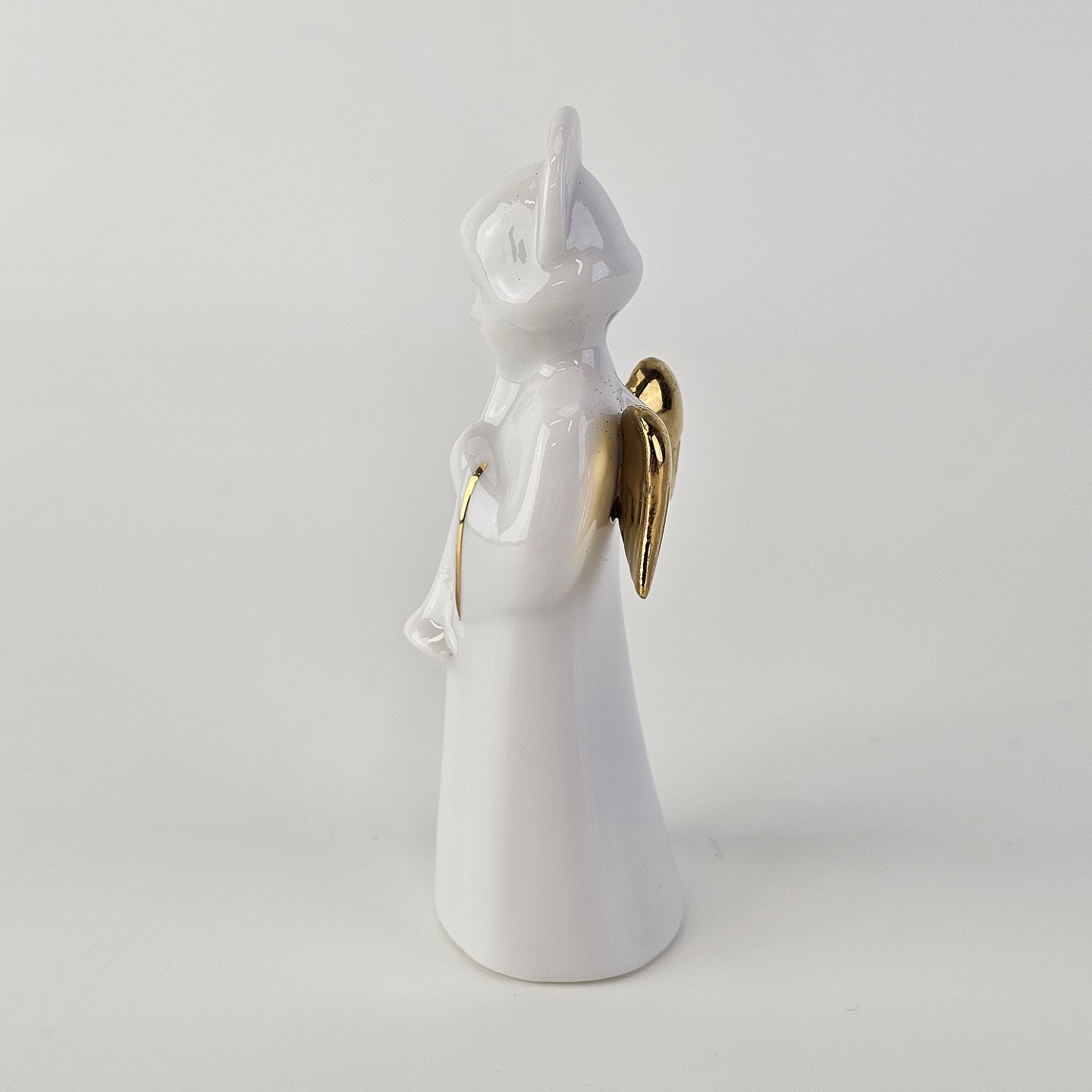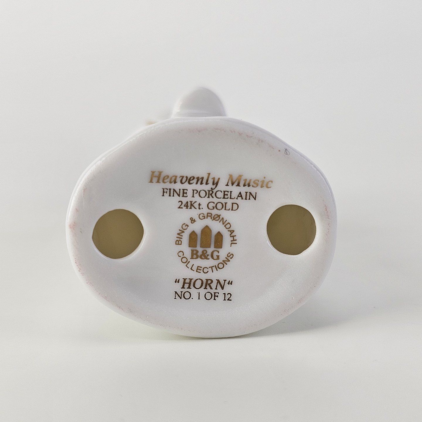 Beskrivelse: Figur med motiv af en engel som spiller på horn. Figuren er i hvidt porcelæn med forgyldte vinger og detaljer i 24 karat guld.