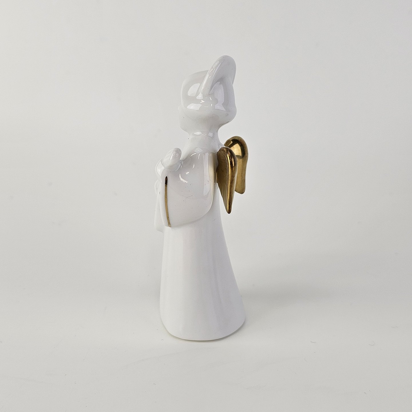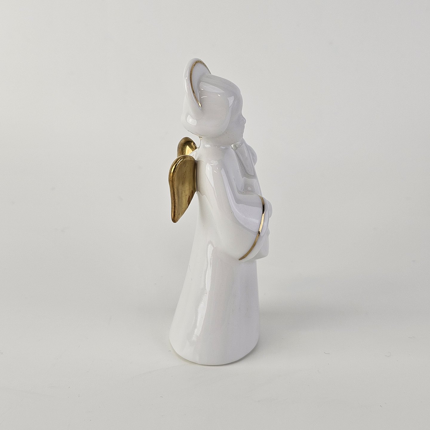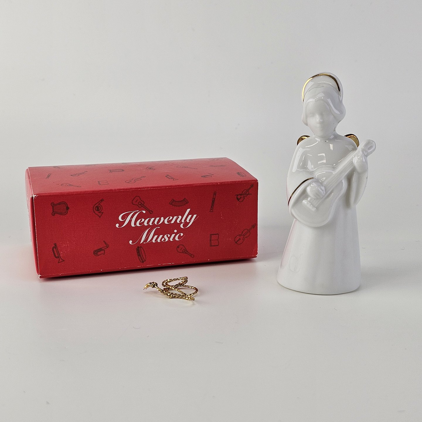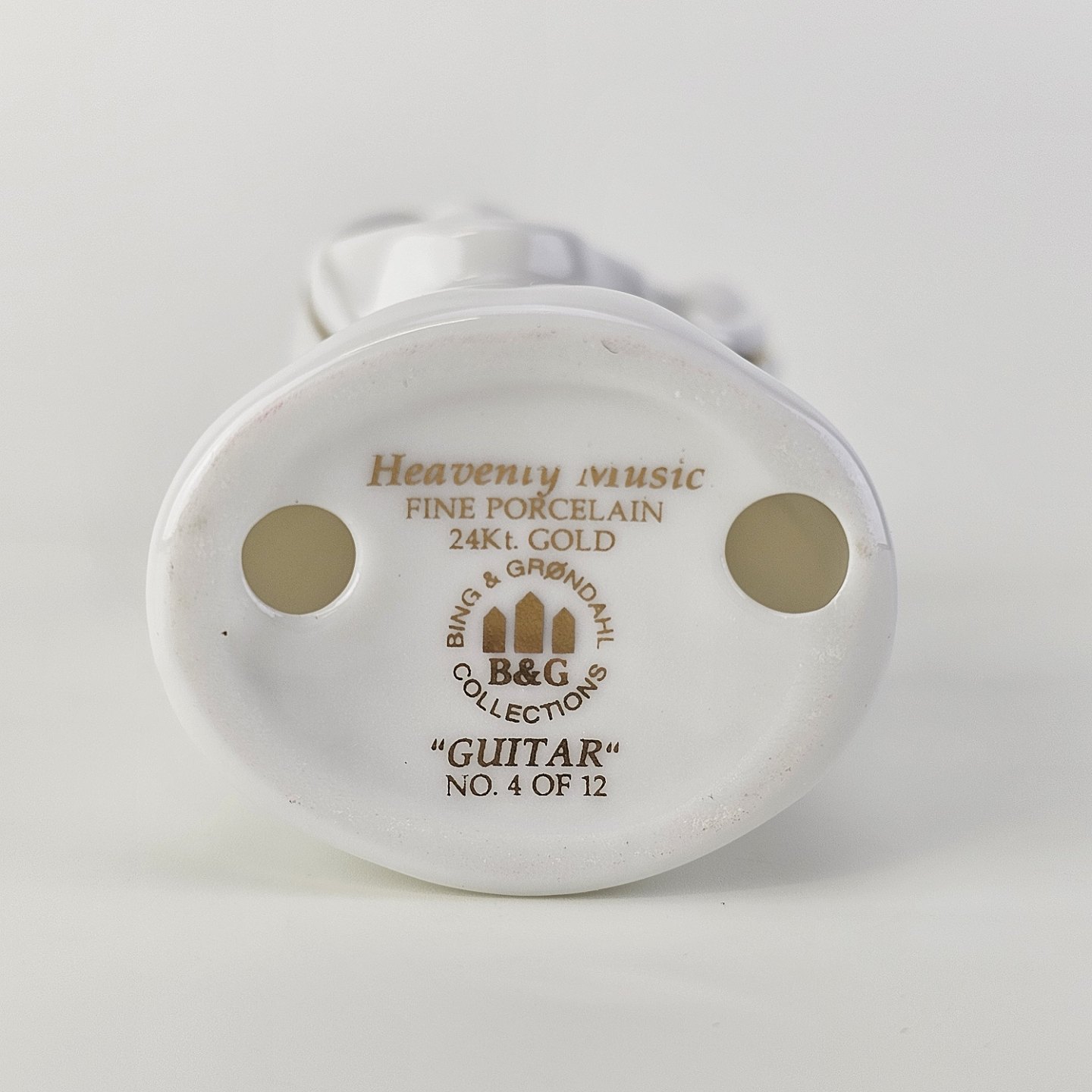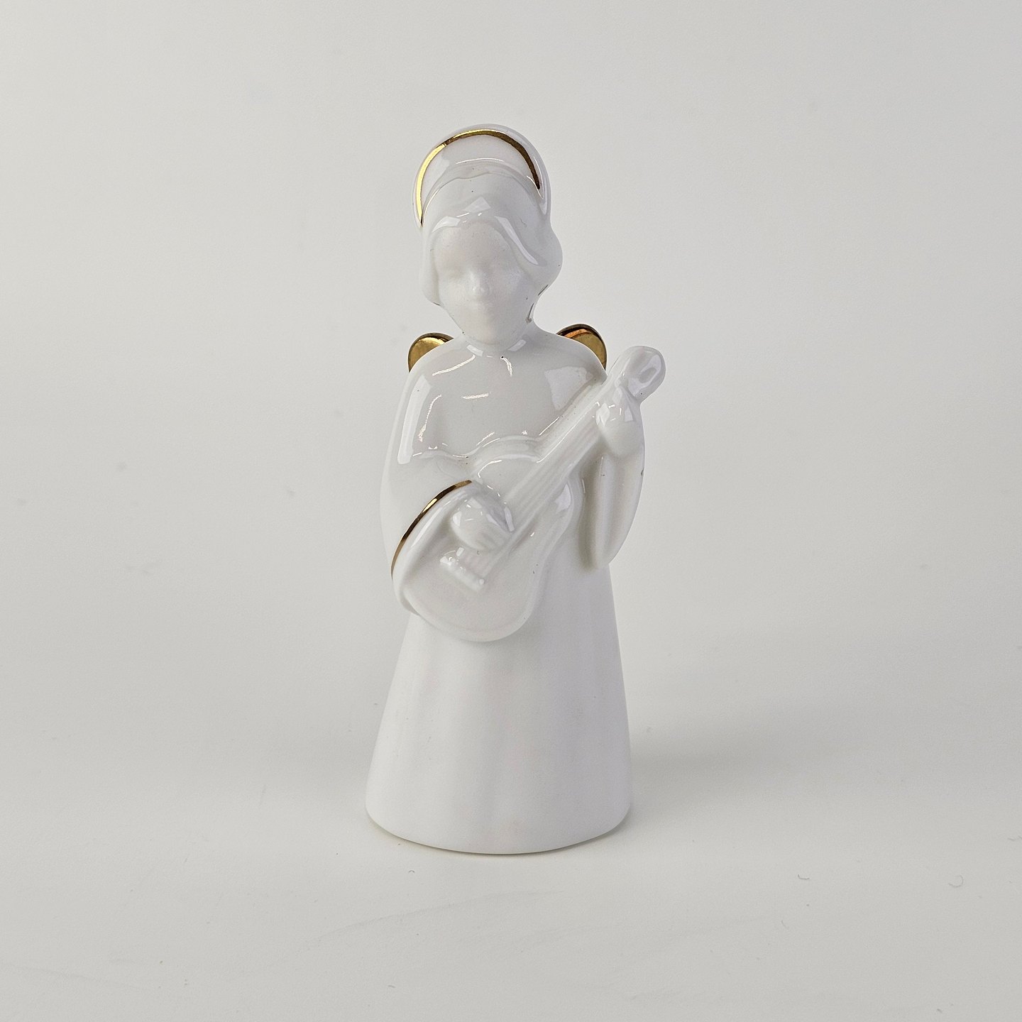 Beskrivelse: Figur med motiv af en engel som spiller på guitar. Figuren er i hvidt porcelæn med forgyldte vinger og detaljer i 24 karat guld.