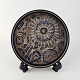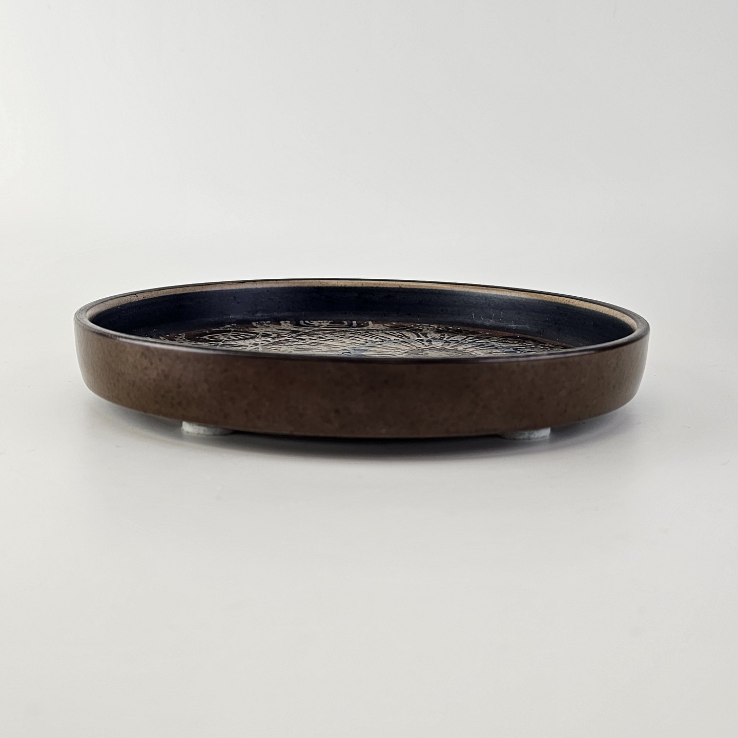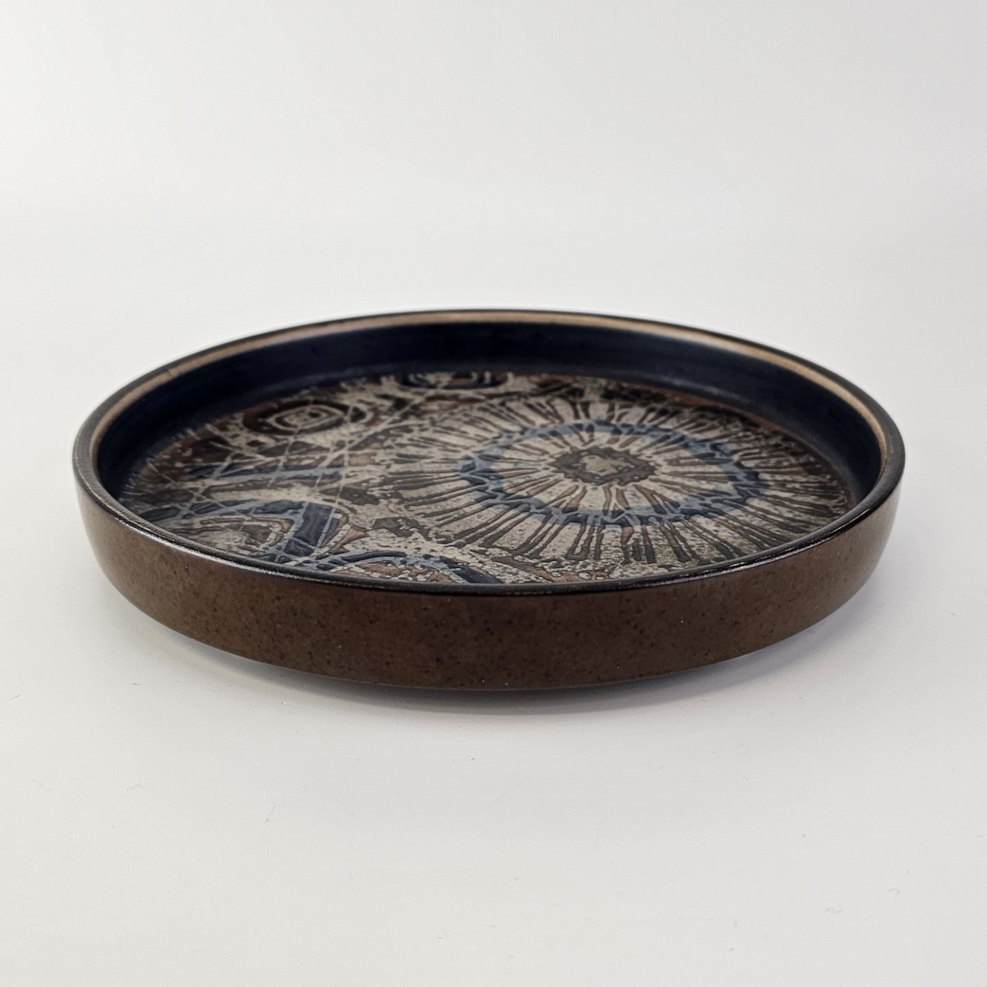 Beskrivelse: Flad rund skål i fajance fra Baca serien med mønster i brune nuancer