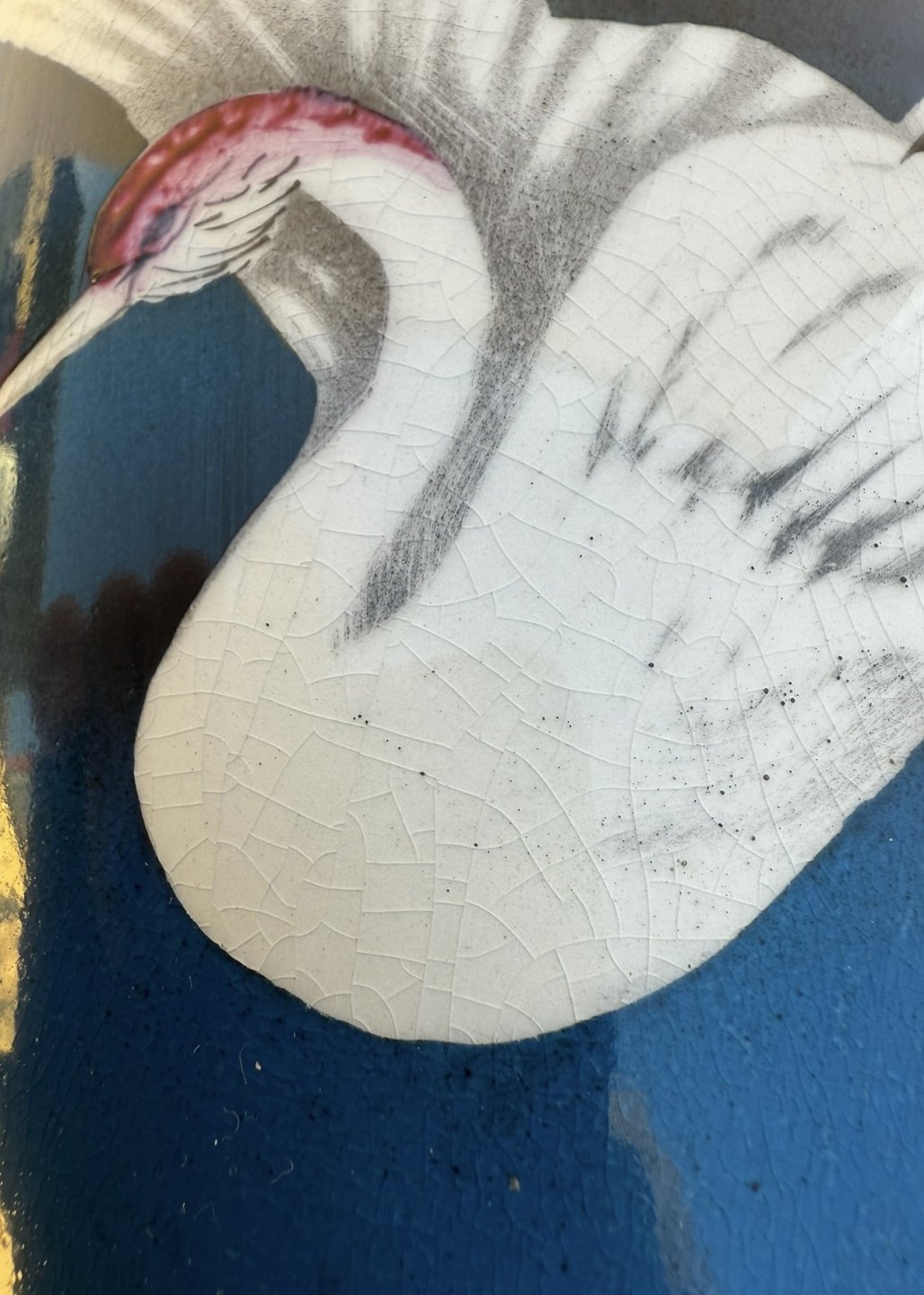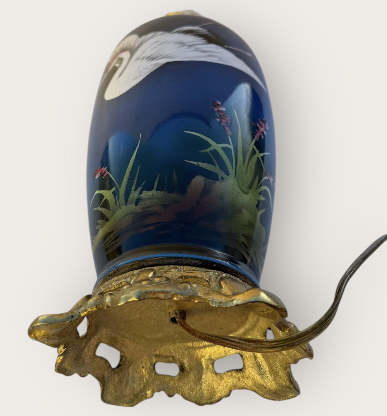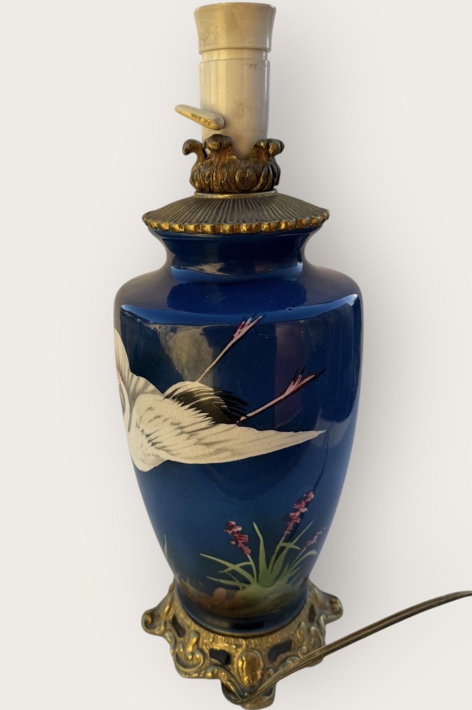 Beskrivelse: Stor bordlampe med flyvende fugl i porcelæn og messing, højde med fatning 39cm *Enkelte småkrakeleringer under glasuren (se foto) ellers flot stand