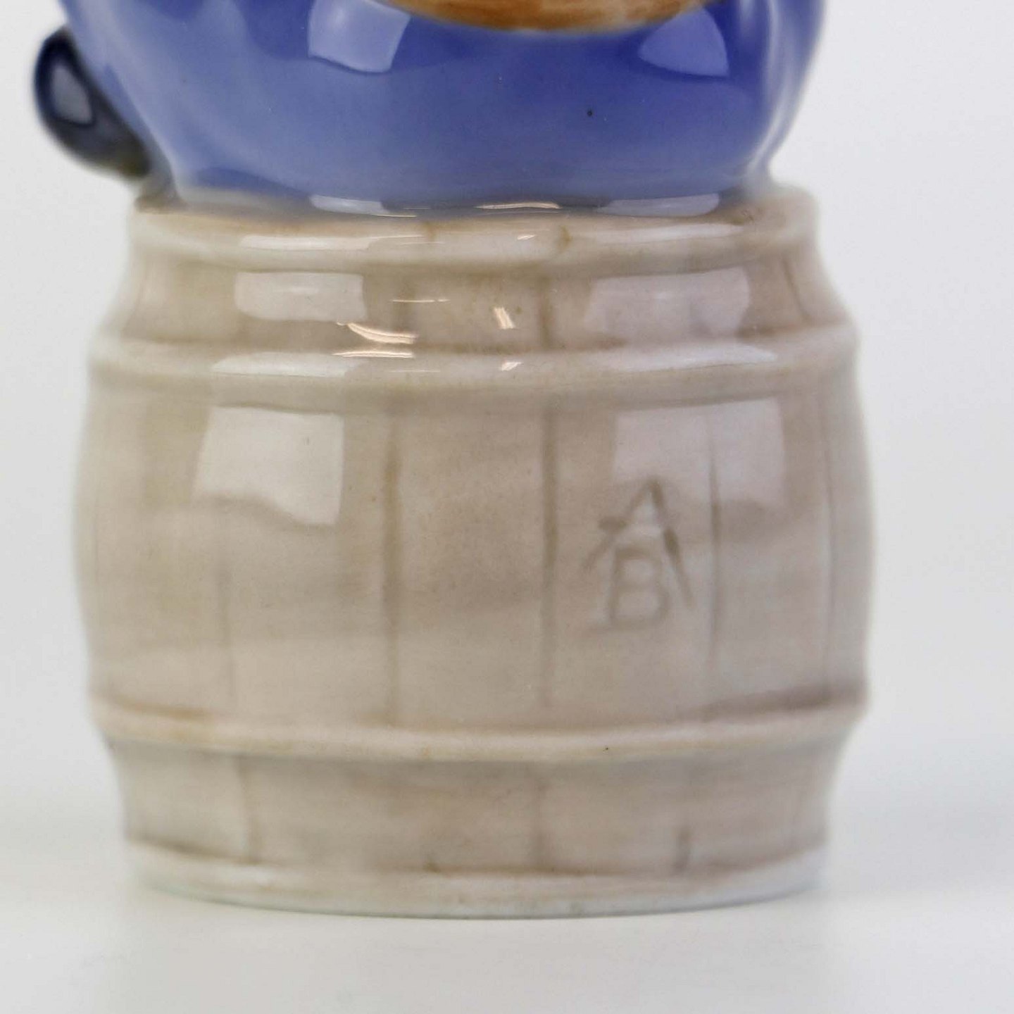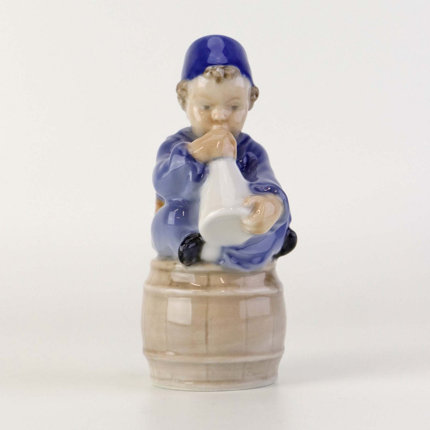 Beskrivelse: Figur i porcelæn med motiv af siddende dreng på tønde blæsende på et horn. Nr. 3689