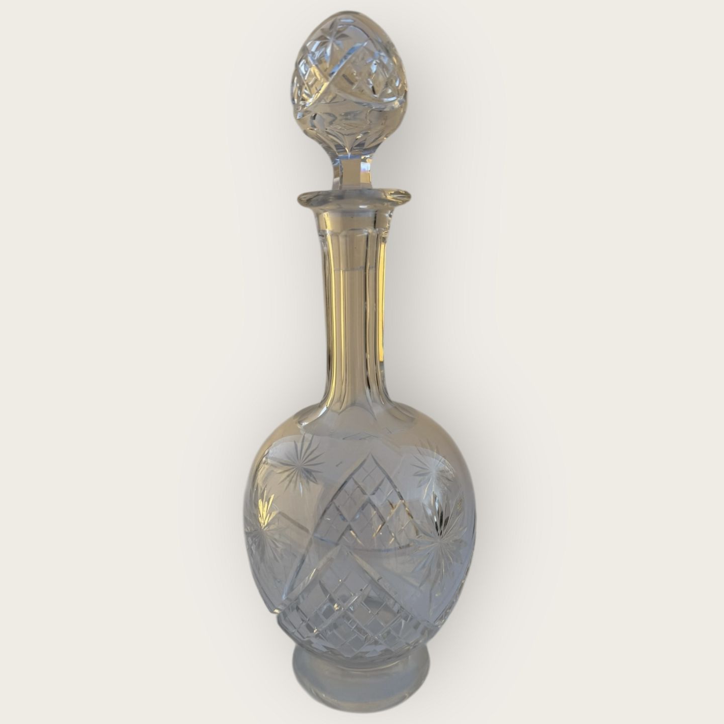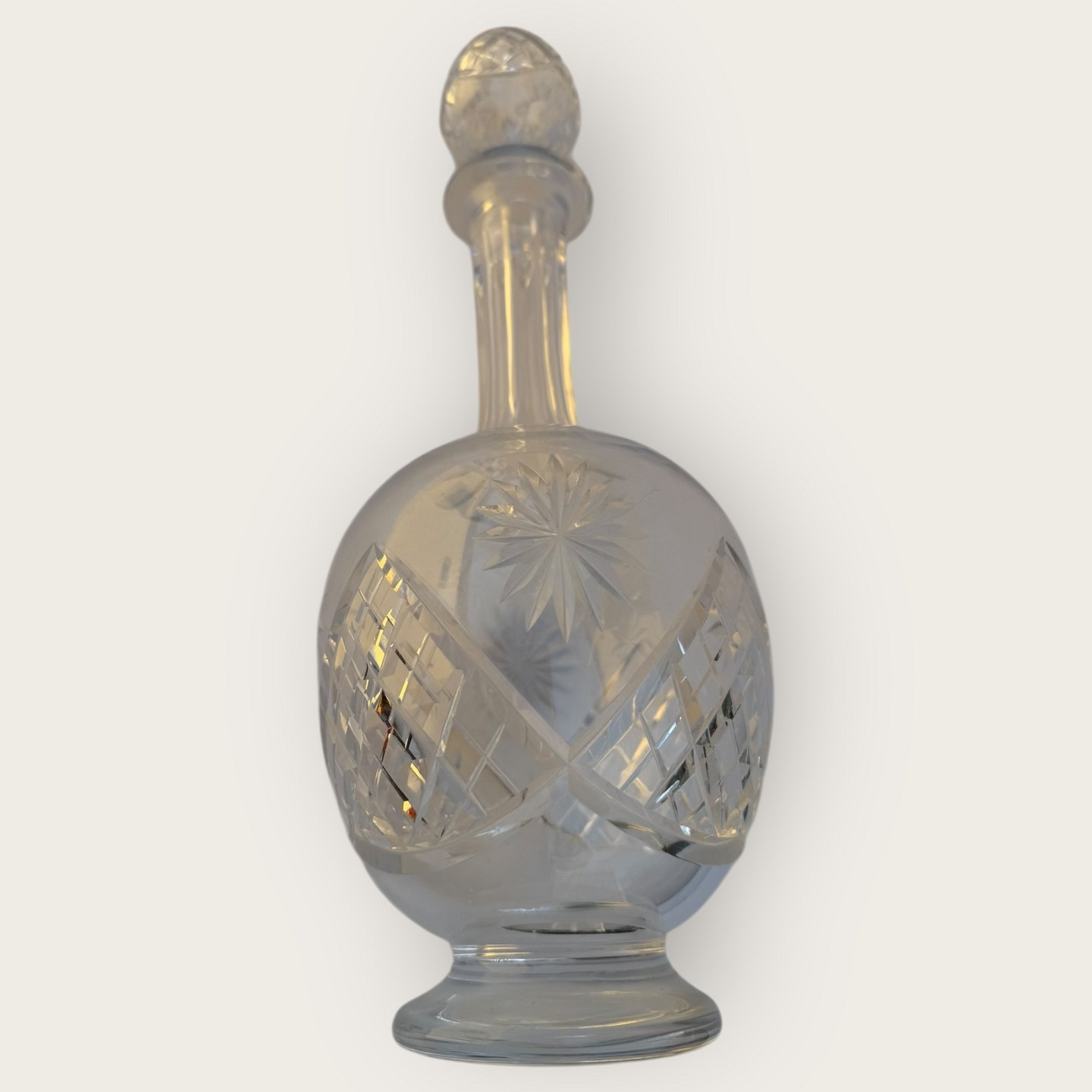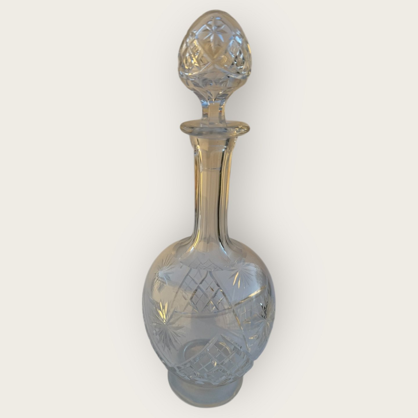 Beskrivelse: Karaffel med mange slibninger, 31cm høj, *lille smule kalkaflejring i bunden ellers pæn stand*