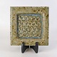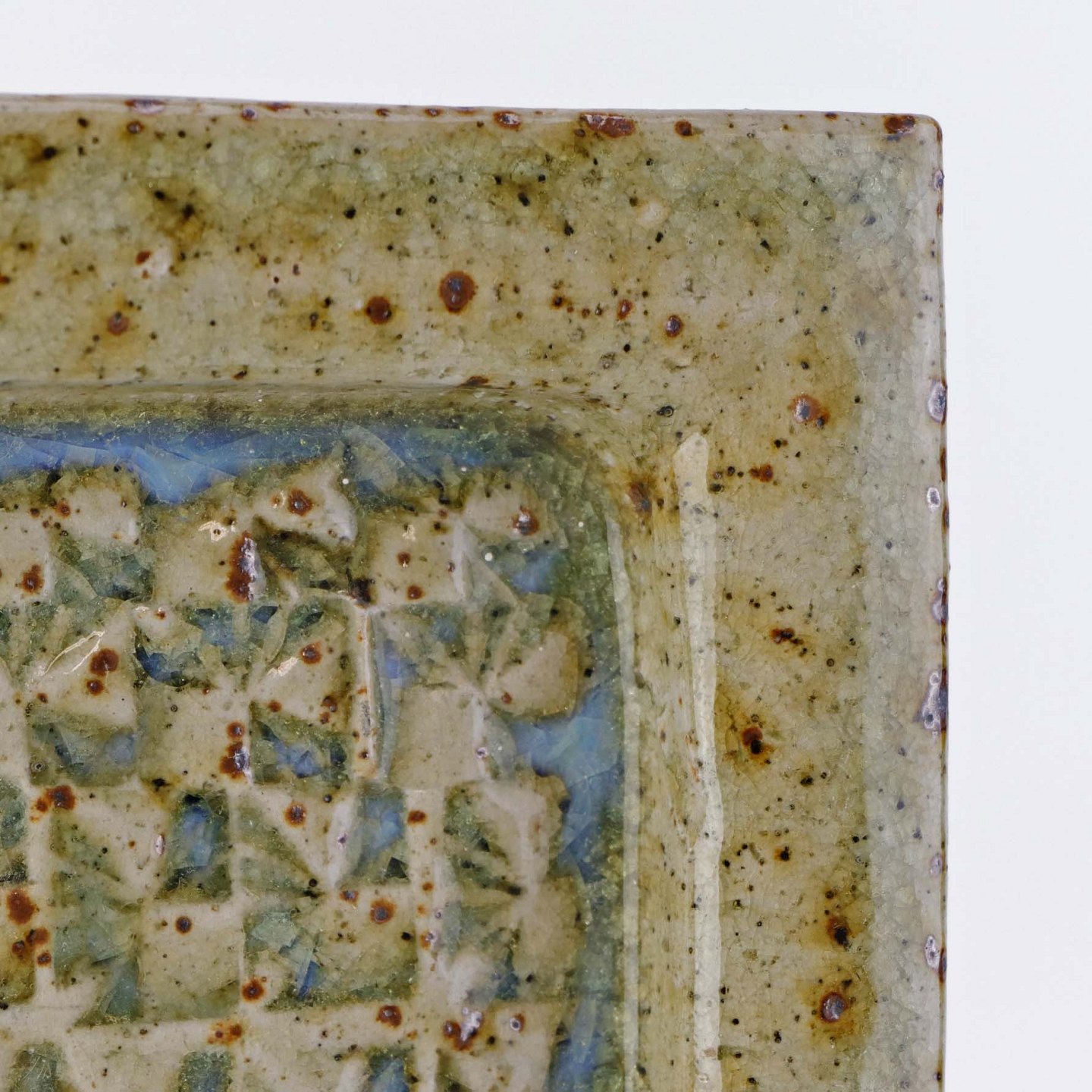 Beskrivelse: Firkantet fad i keramik med struktureret bund med lyseblå og beige glasur med røde pigmenter.