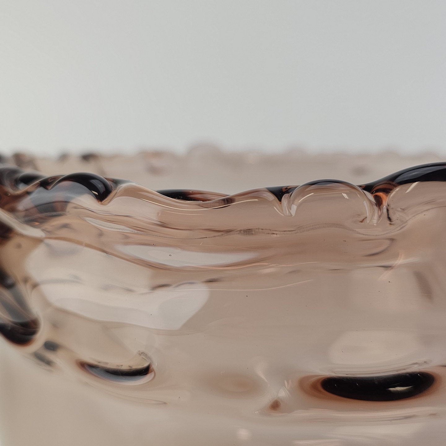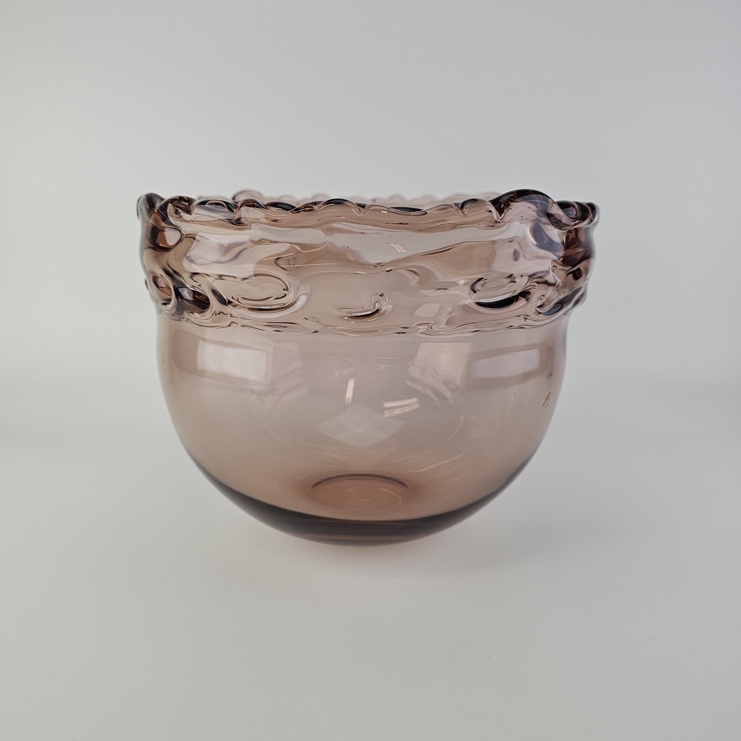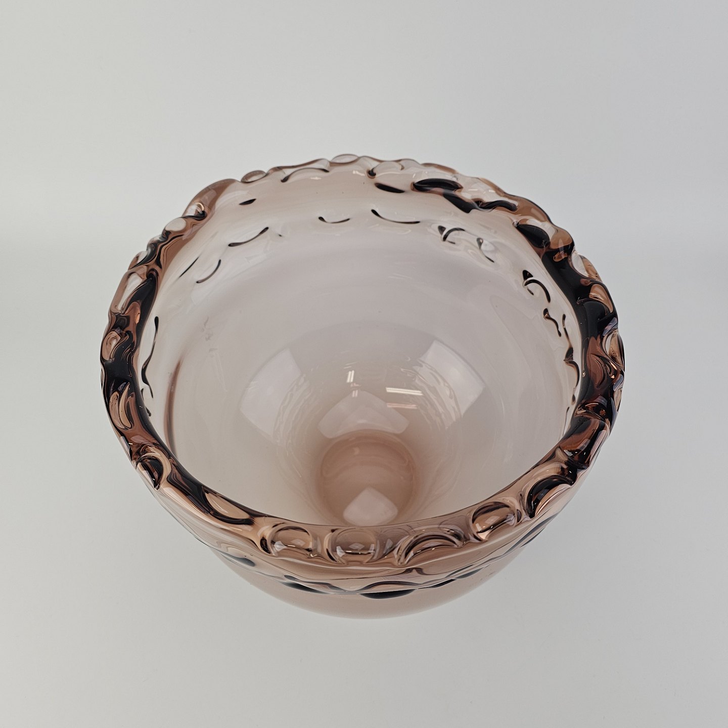 Beskrivelse: Skål i rosafarvet glas med bølget kant fra serien Rosamund