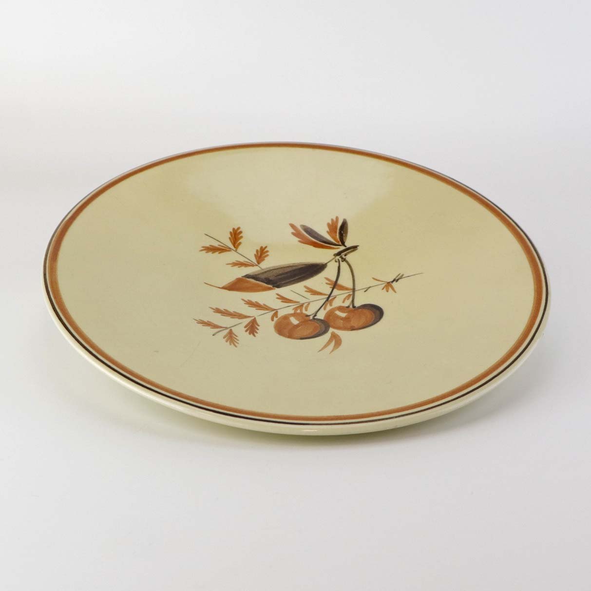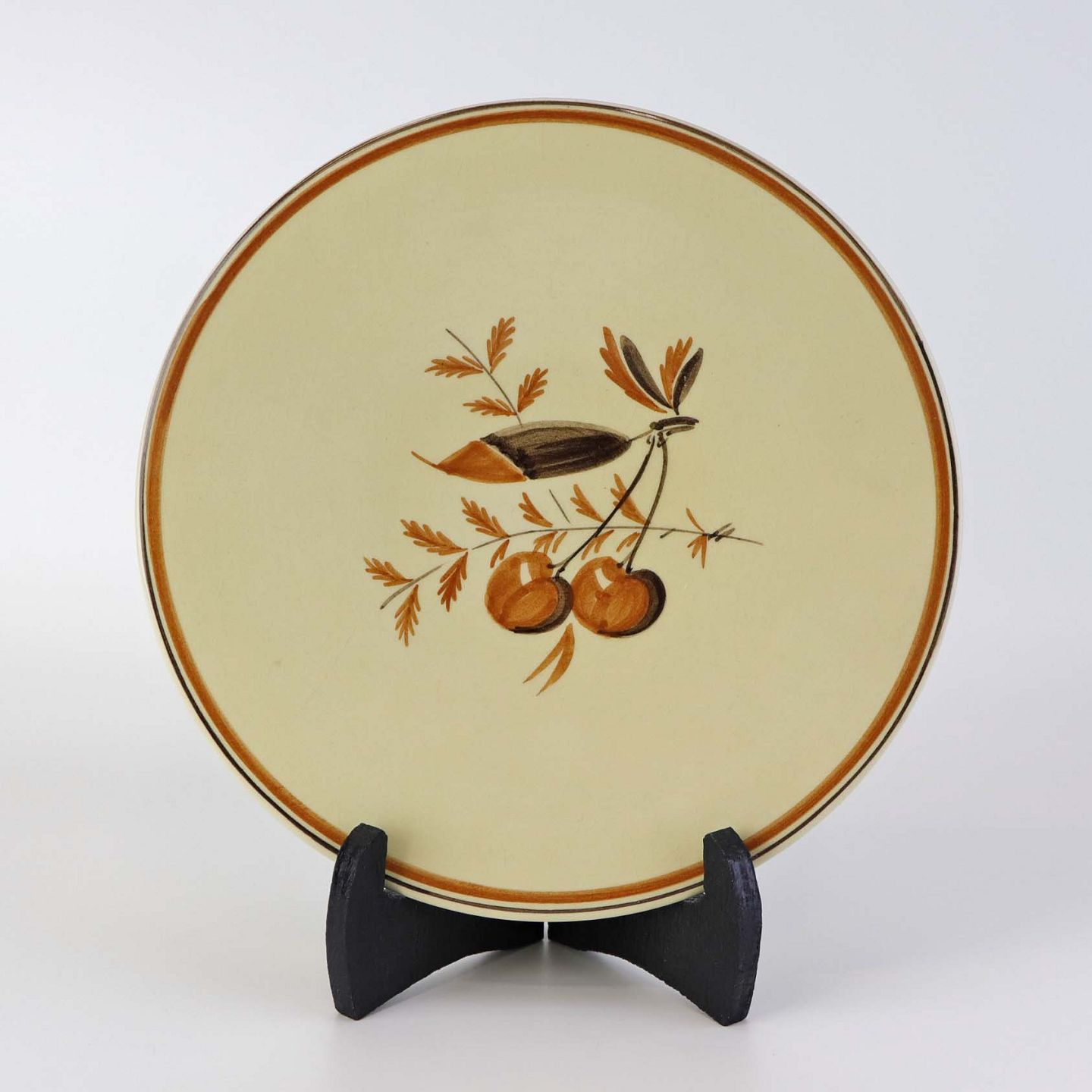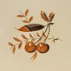 Fajancestel med dekoration af frugter på gullig baggrund med brun og orangerød kant stribe