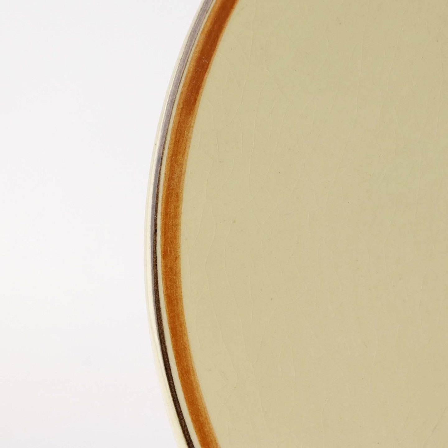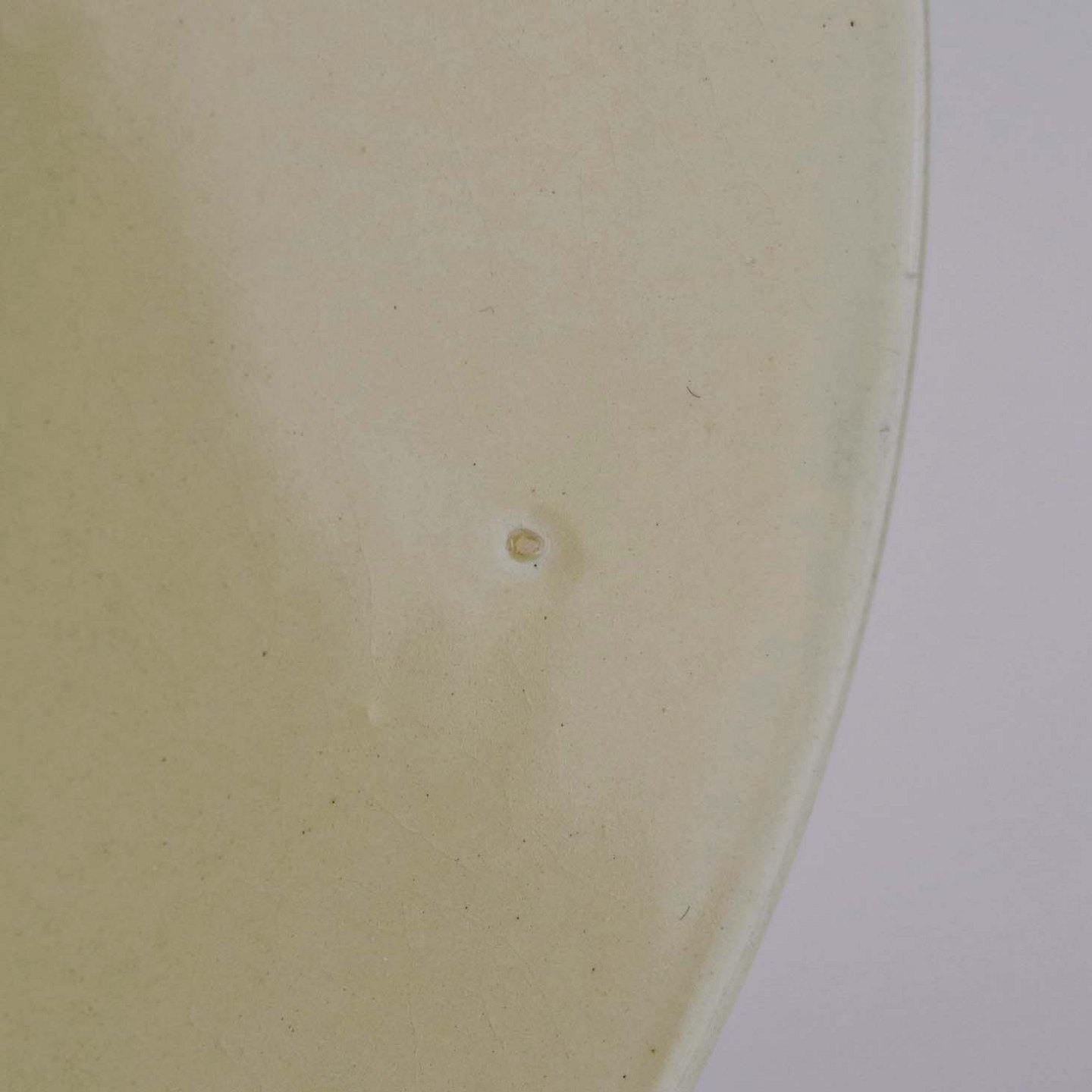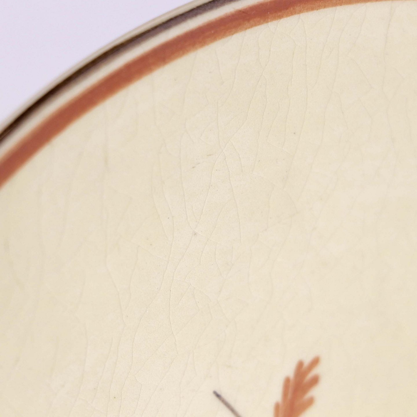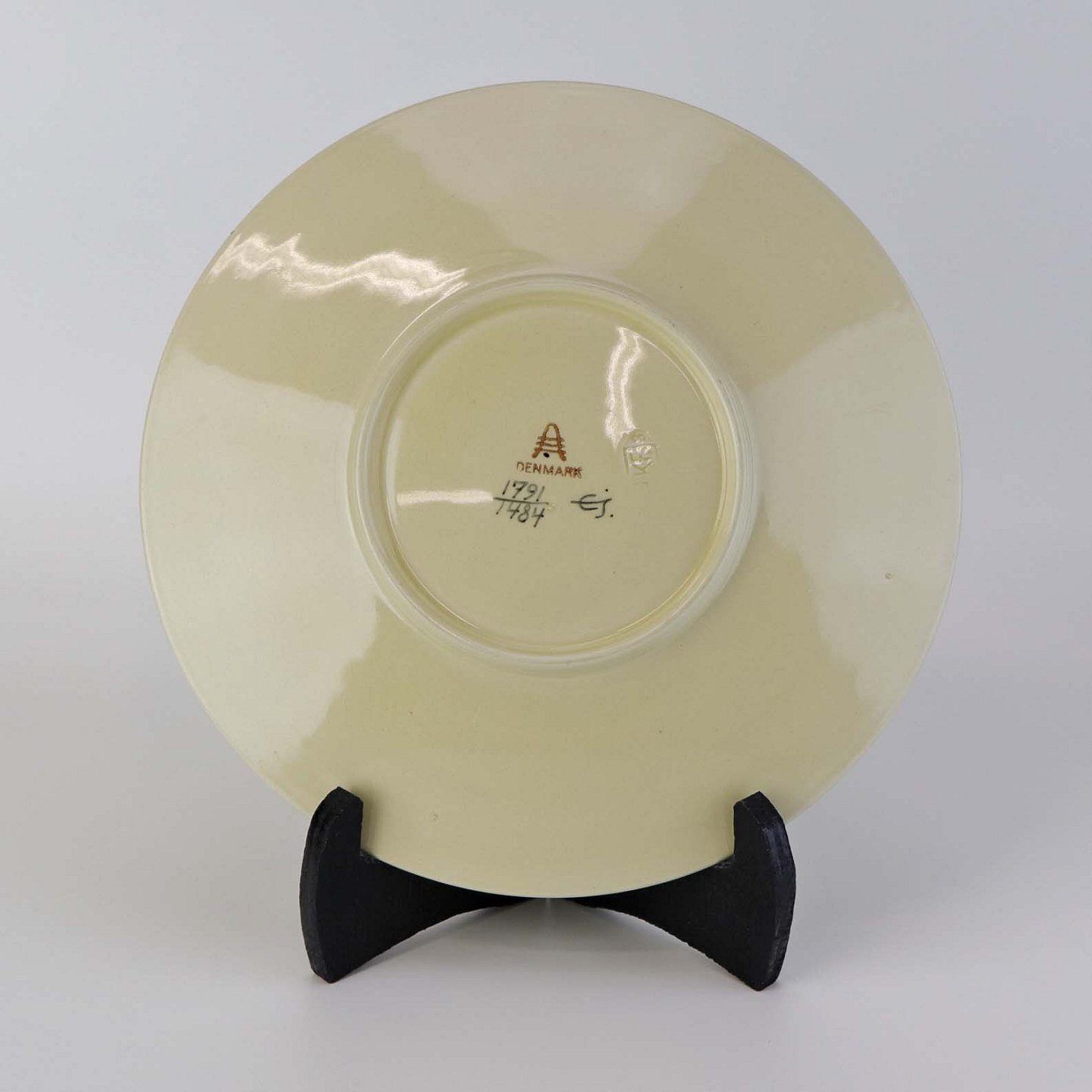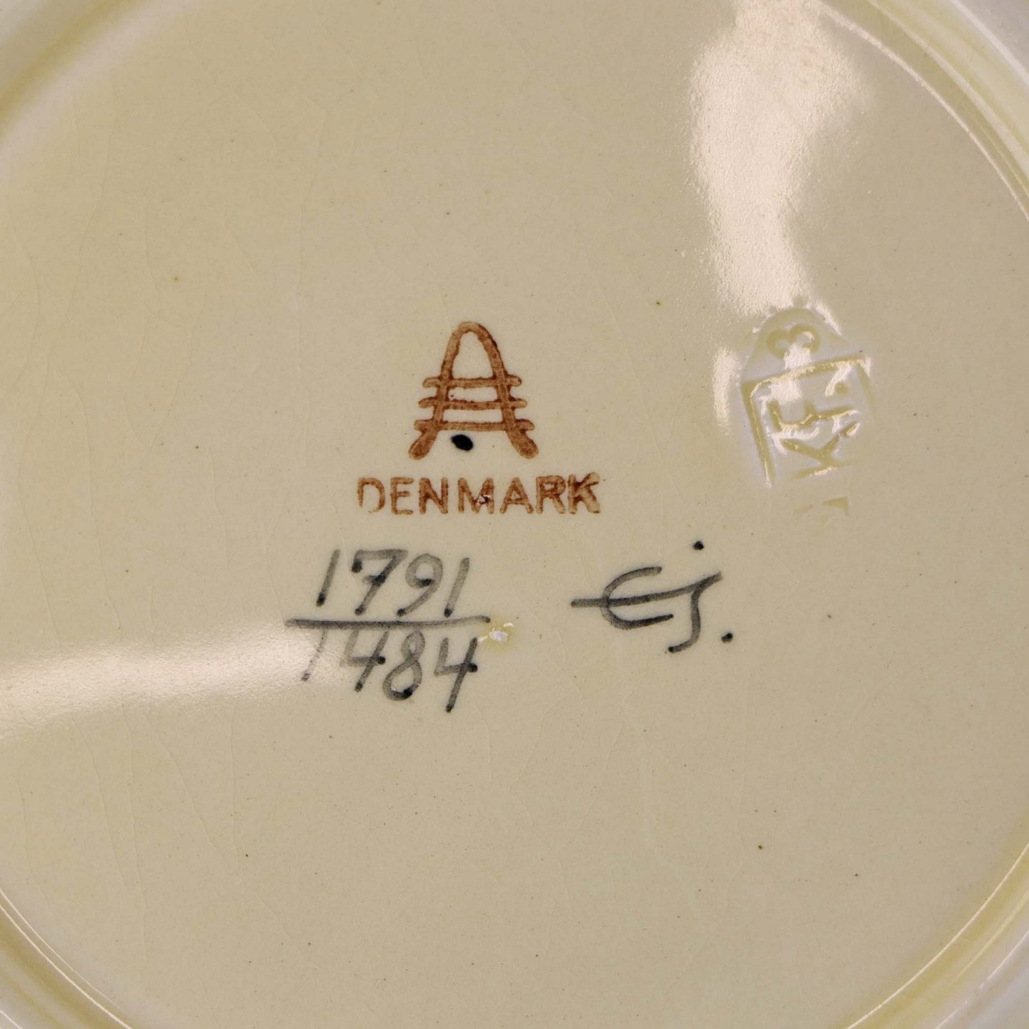 Fremstår med krakeleringer og ujævnheder i glasuren på bagsiden.