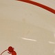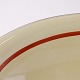 Fajancestel med dekoration af blomsterkurv på gullig baggrund med orangerød kant stribe.