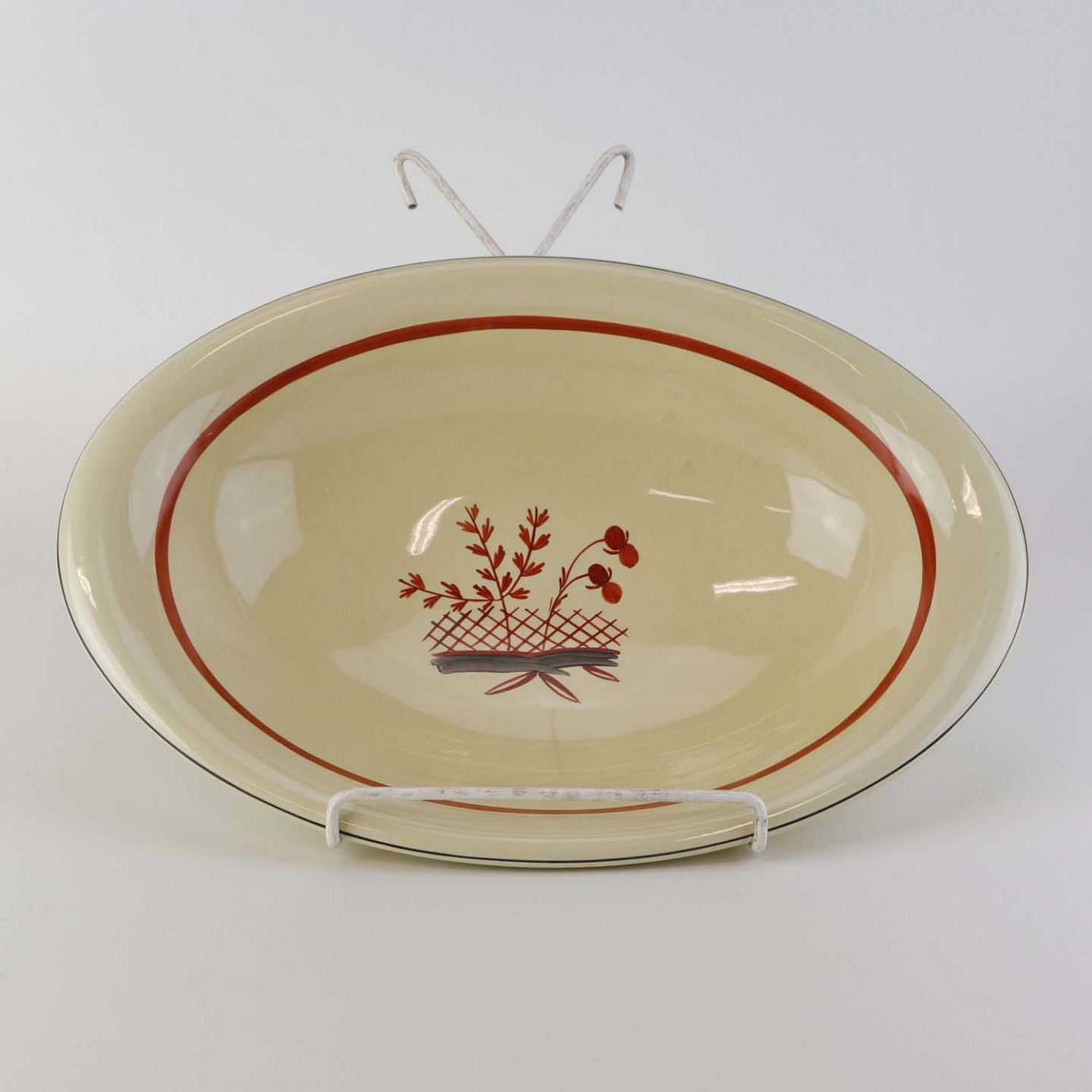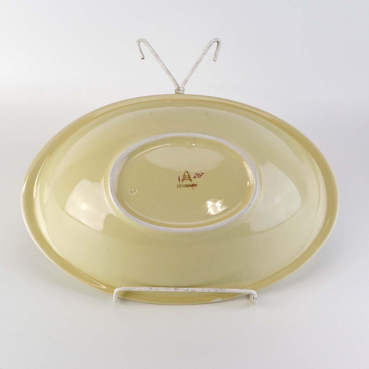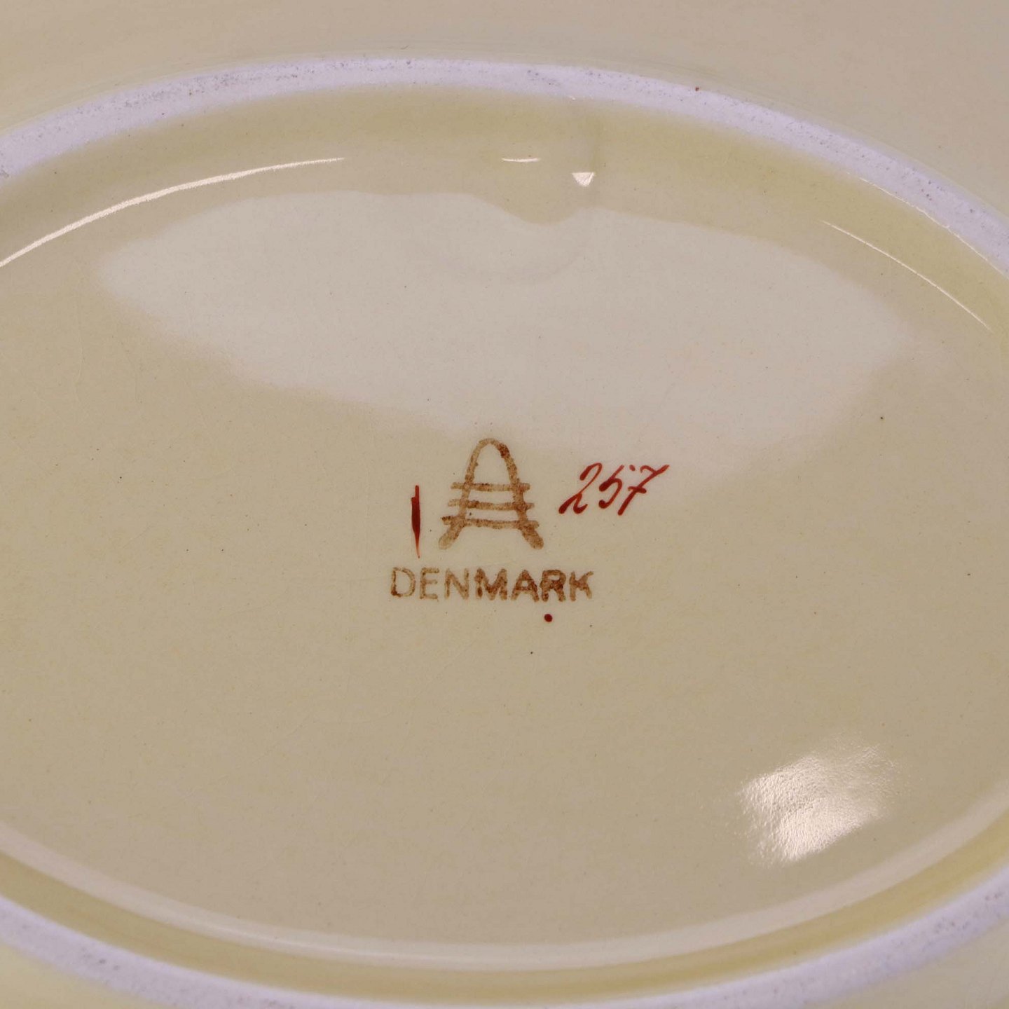 Beskrivelse: Oval serveringsskål i fajance fra stellet Mariager. Nr. 257