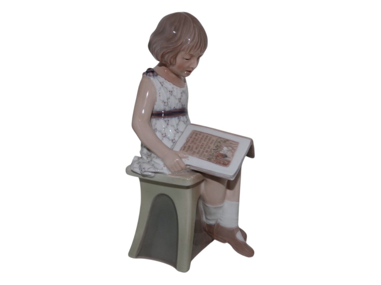 Beskrivelse: Stor Dahl Jensen figur, pige med bog siddende på lysegrøn stol.