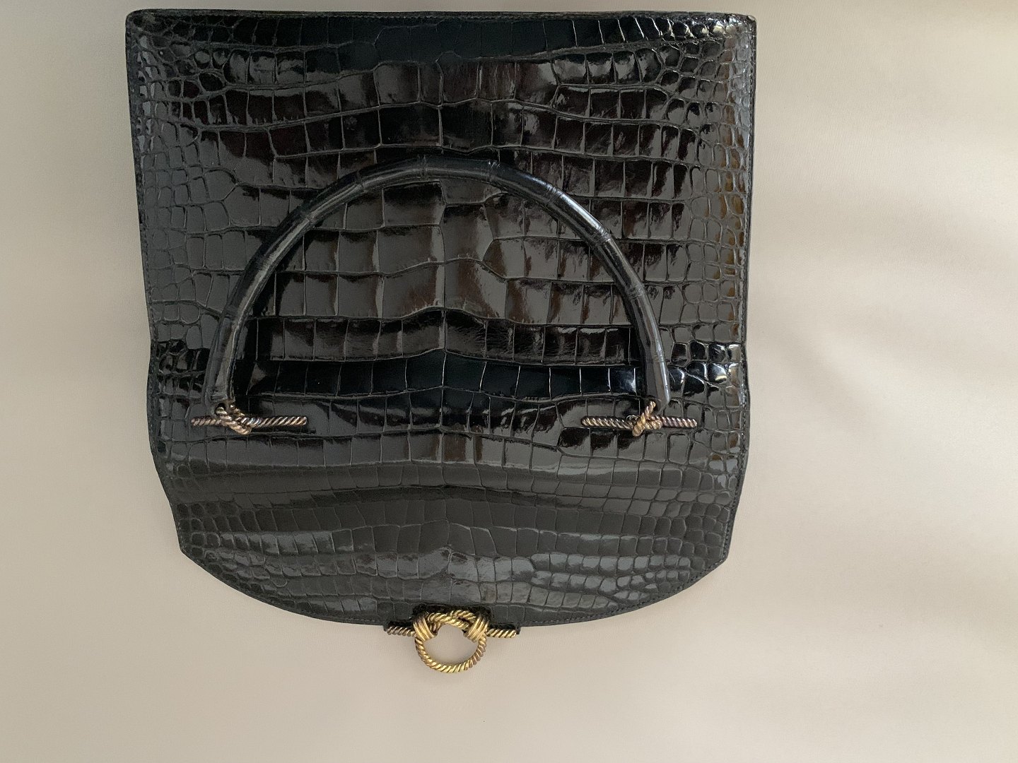Beskrivelse: Hermès - Krokodilleskinds taske fra 1970erne. med fast hank og forgyldte beslag.
