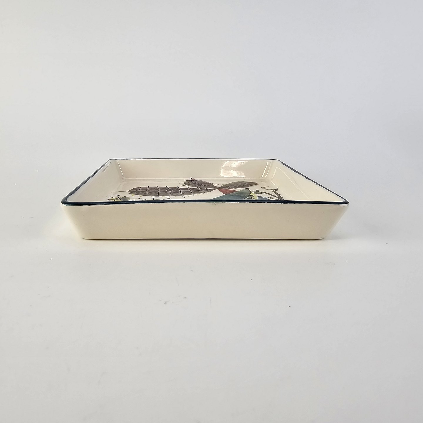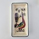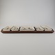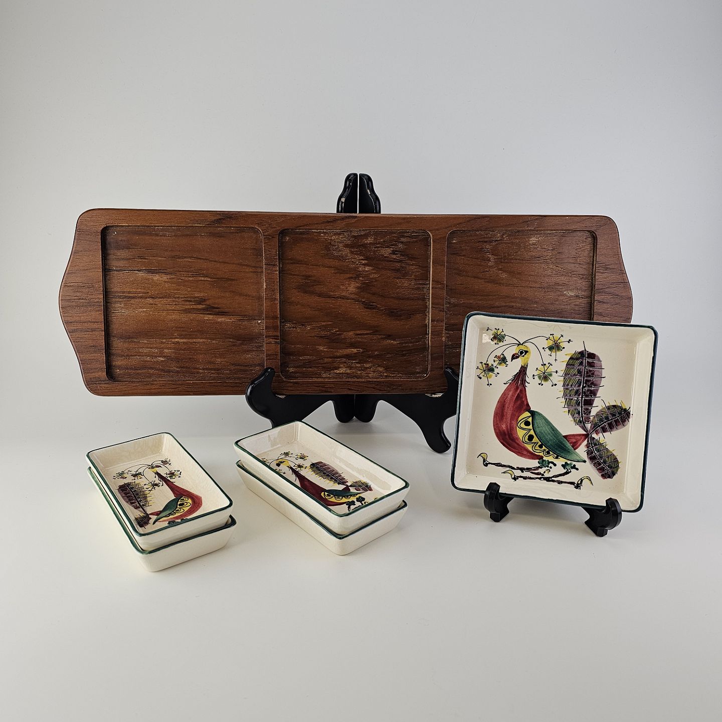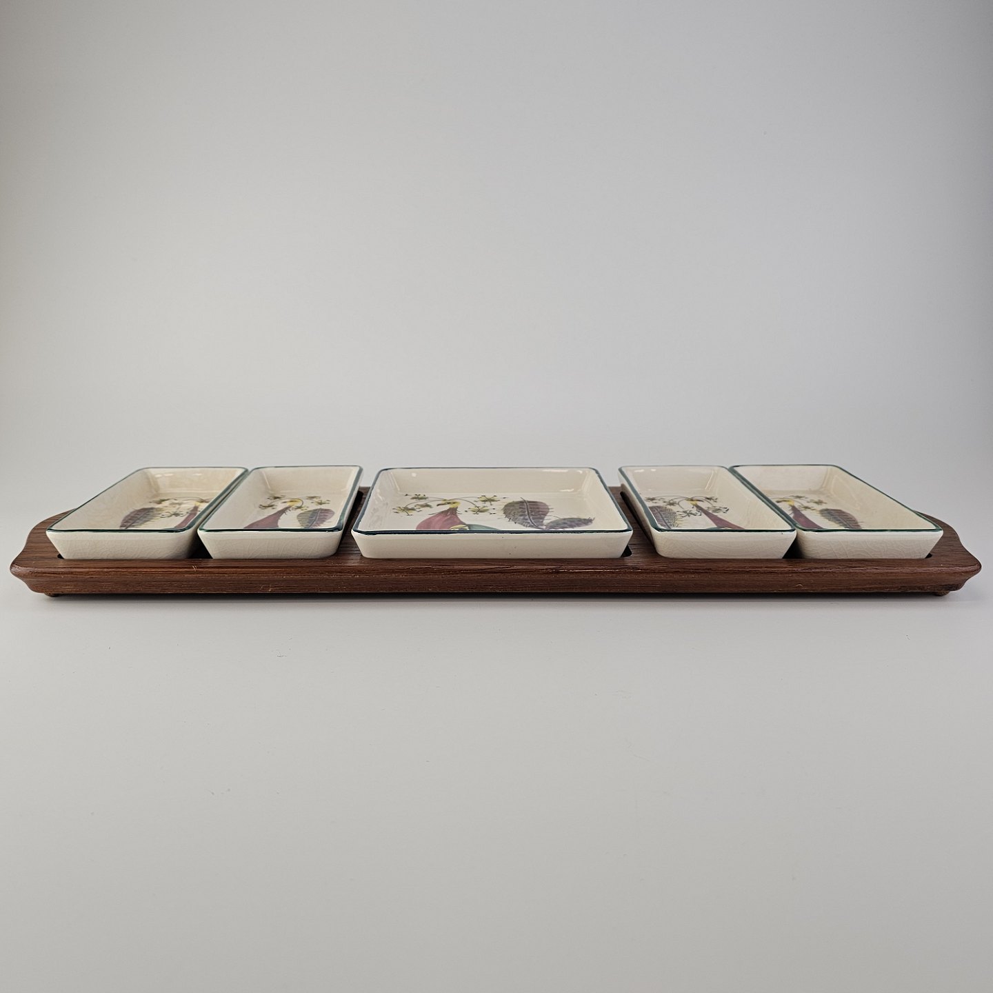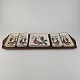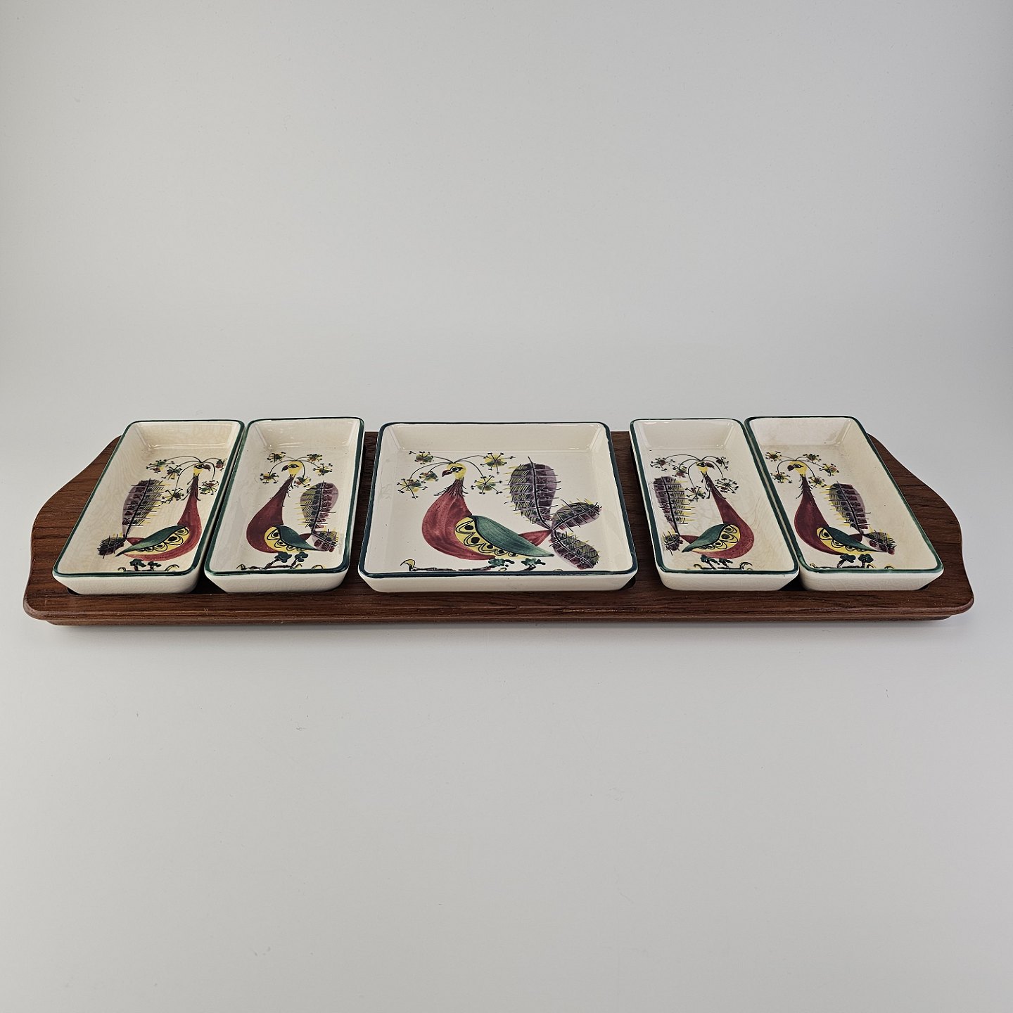 Beskrivelse: Cabaret fad fra serien Tenera med bakke i teak træ og fem små, firkantede fade i fajance med dekoration af påfugle