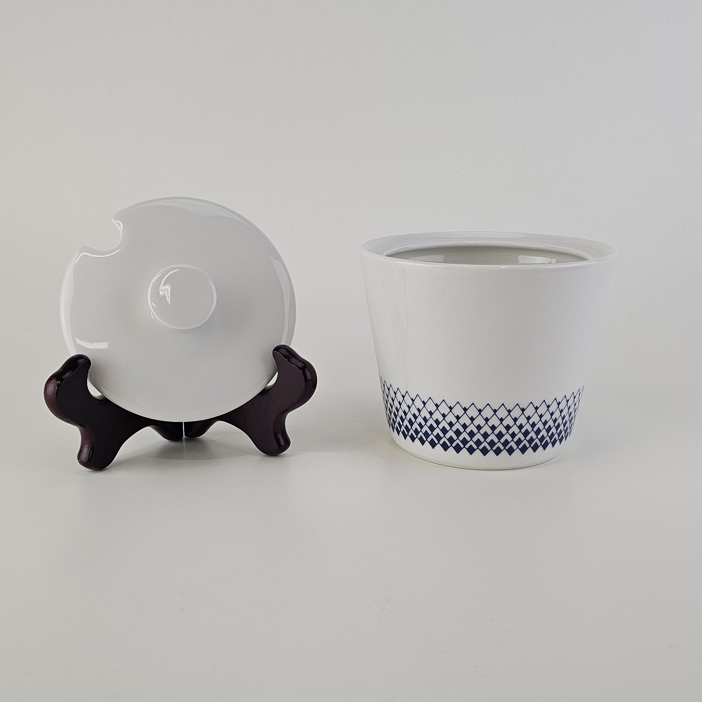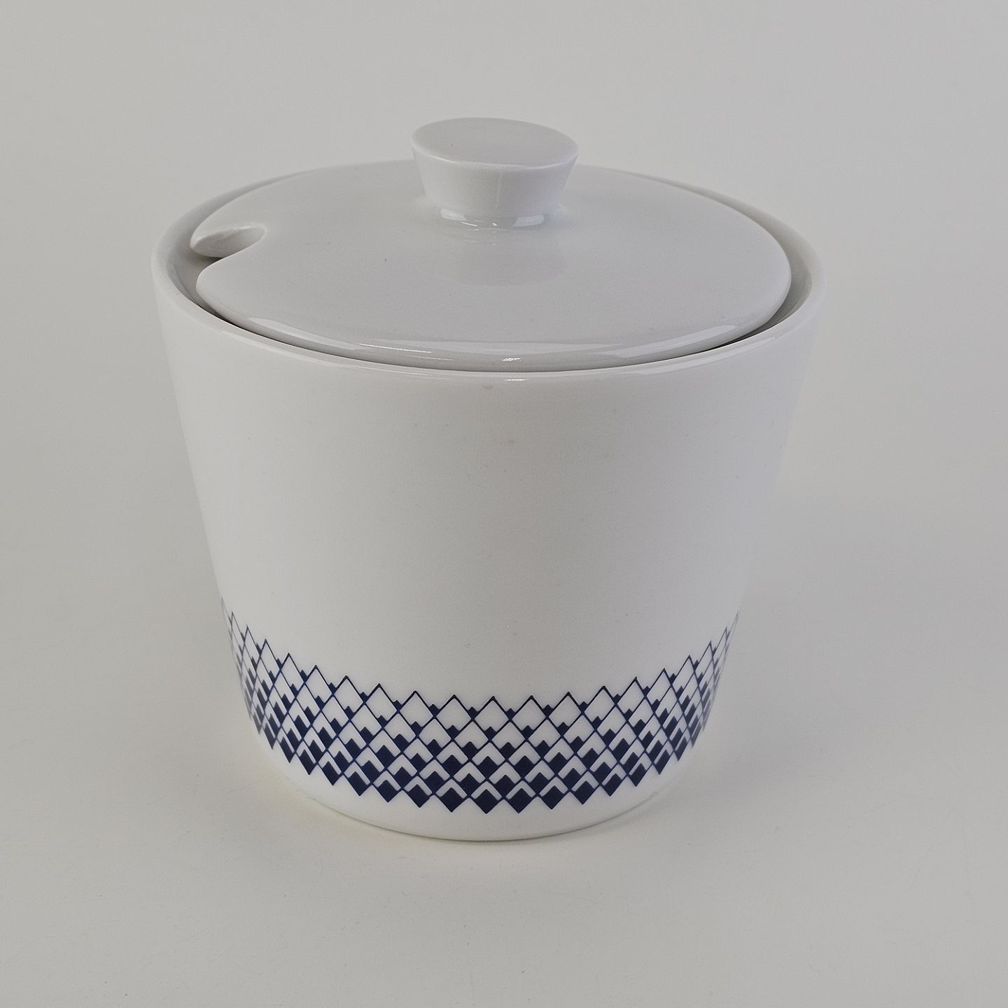 Beskrivelse: Sukkerskål med låg i porcelæn fra stellet Romber