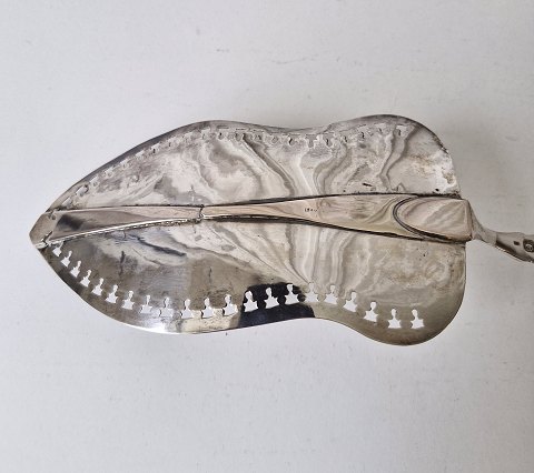 Stor fiskespade i sølv med perlemors håndtag. Sølv laf med gennembrudt kant, smukt dekoreret med en engel og blomster. Perlemors håndtaget er smukt udskåret med en påugl. |