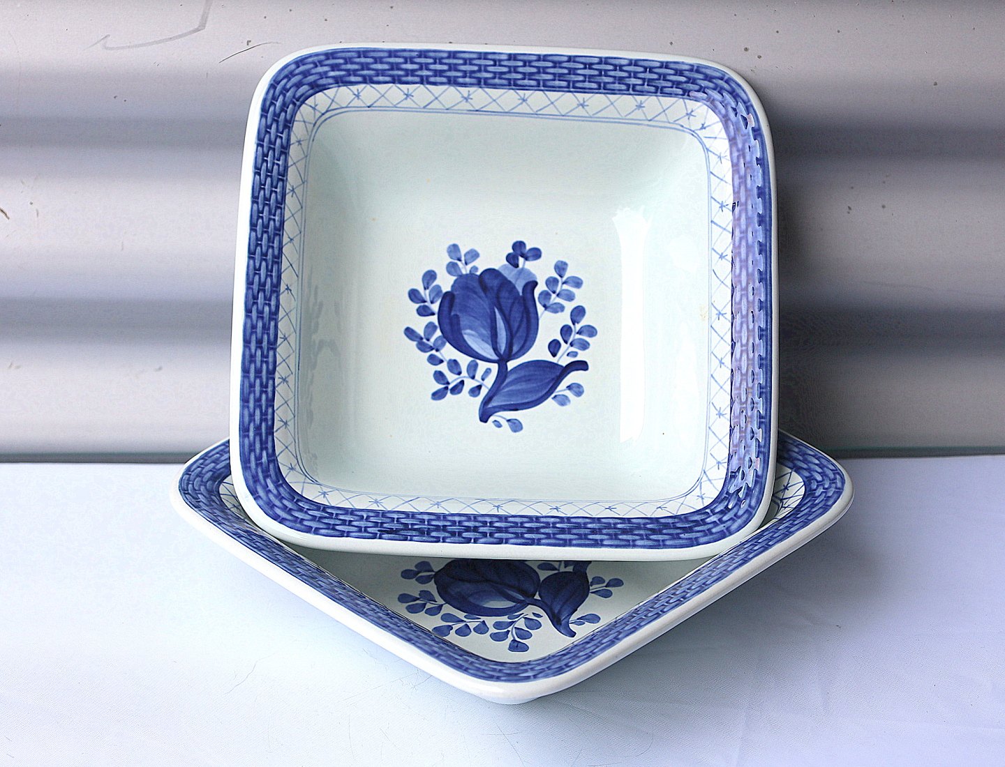 Dekoreret med blå tulipan indrammet af blåt fletmønster.