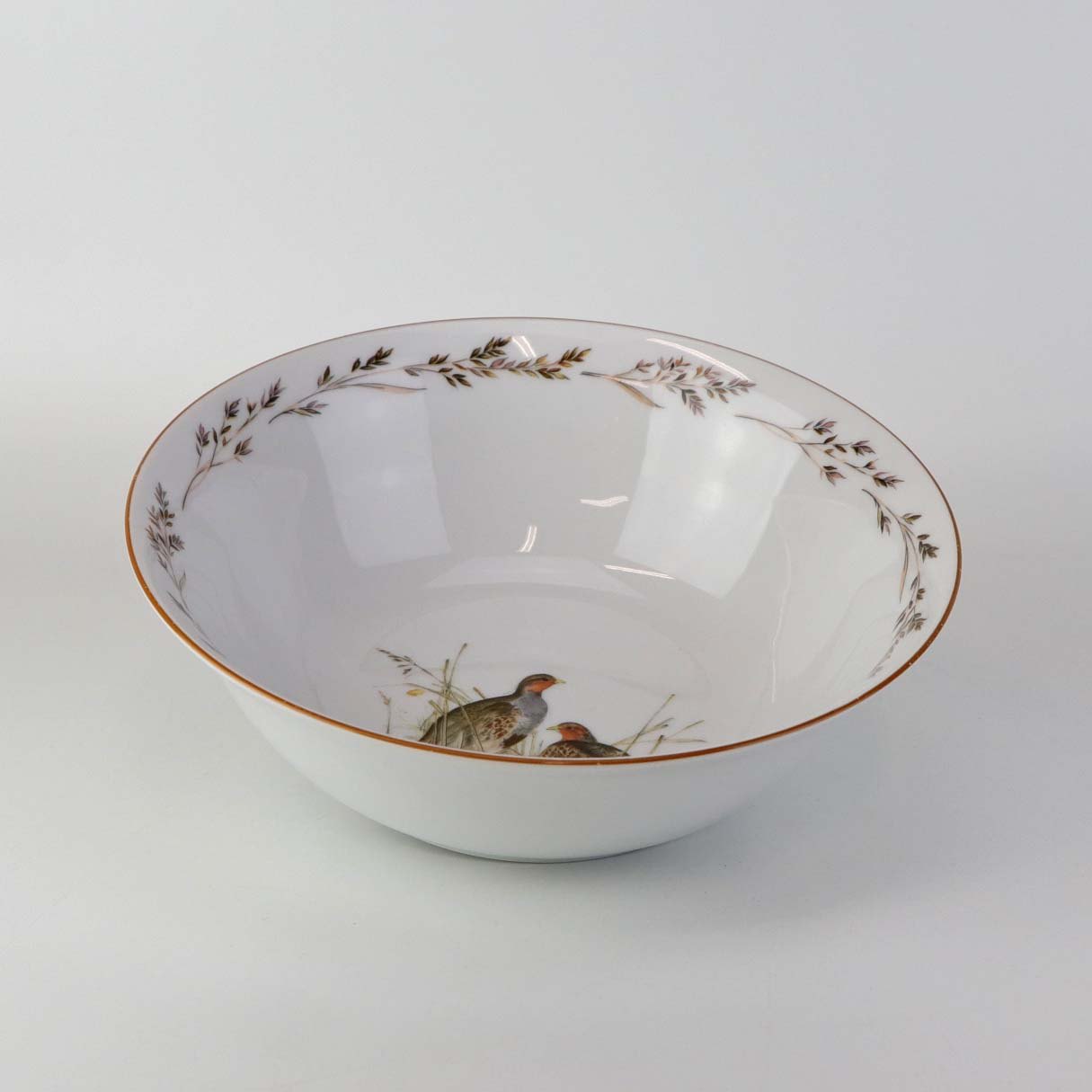 Rund skål til kartofler i porcelæn med motiv af agerhøns fra stellet Jagtstel.
