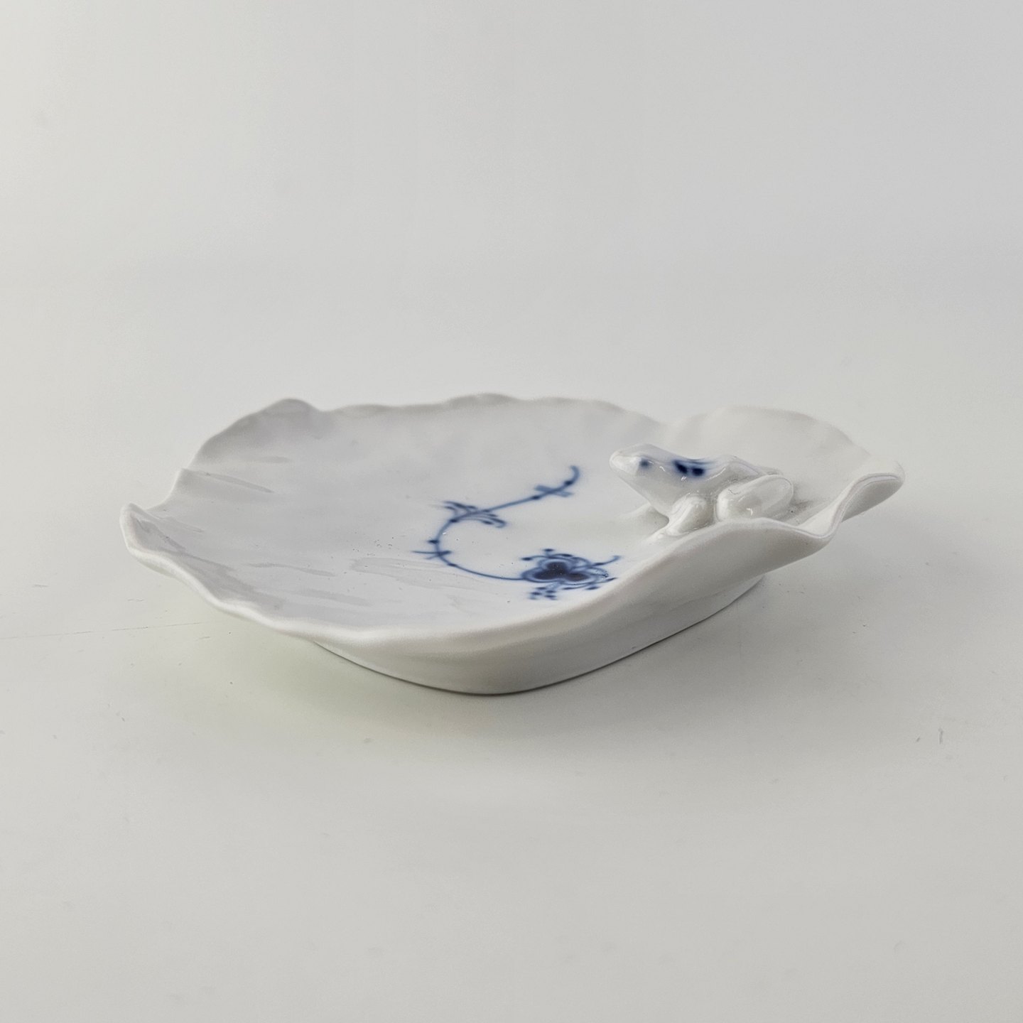 Skål i hvidt kongeligt porcelæn med motiv af en frø på en åkande og musselmalet dekoration