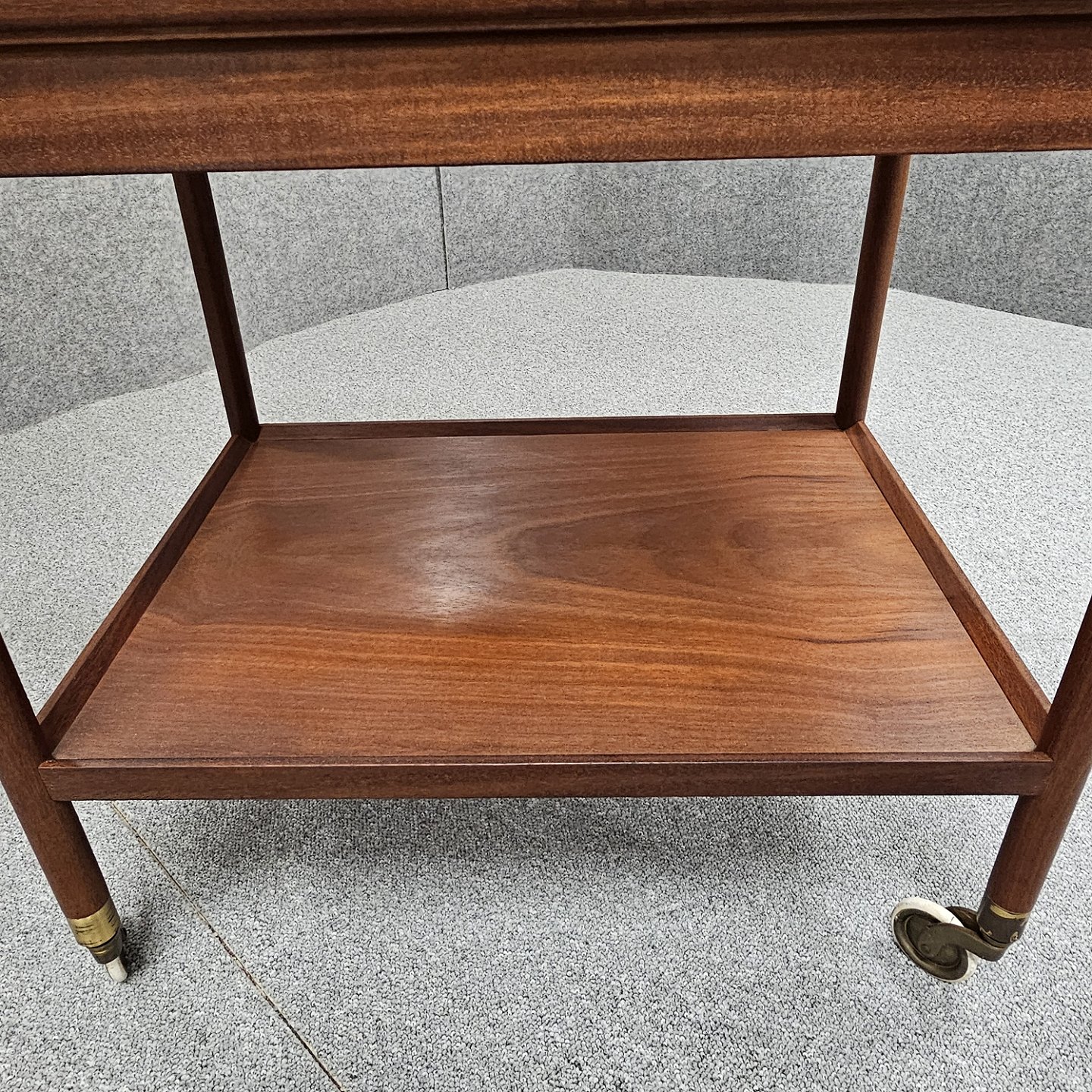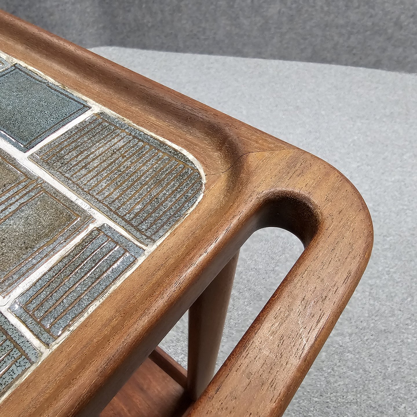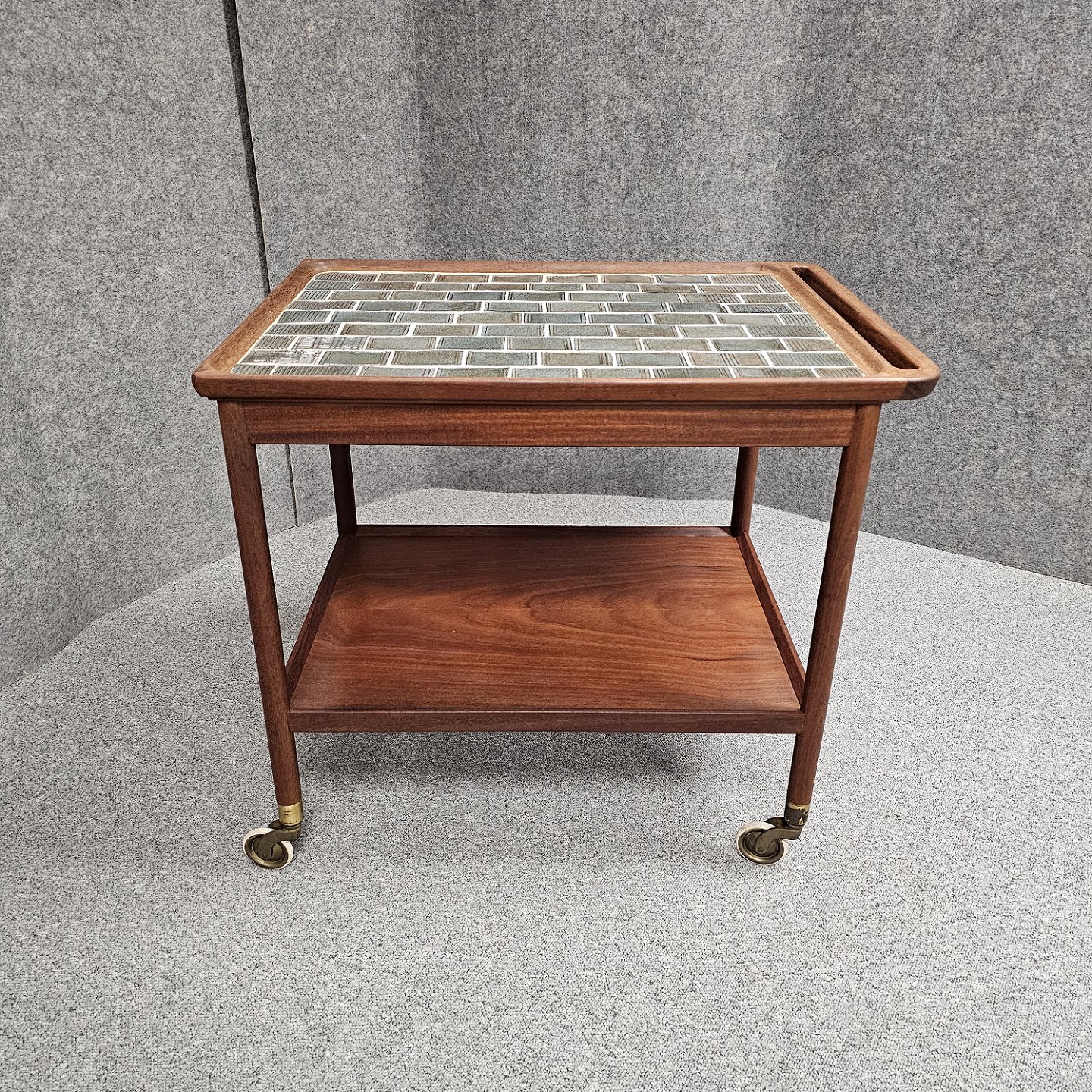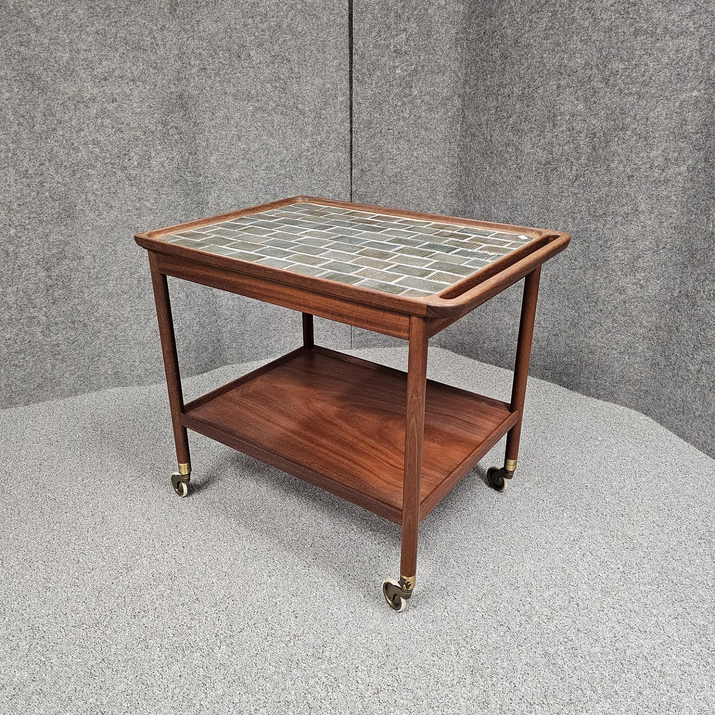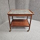 Rullebord i teak dekoreret med kakler i grønlige nuancer