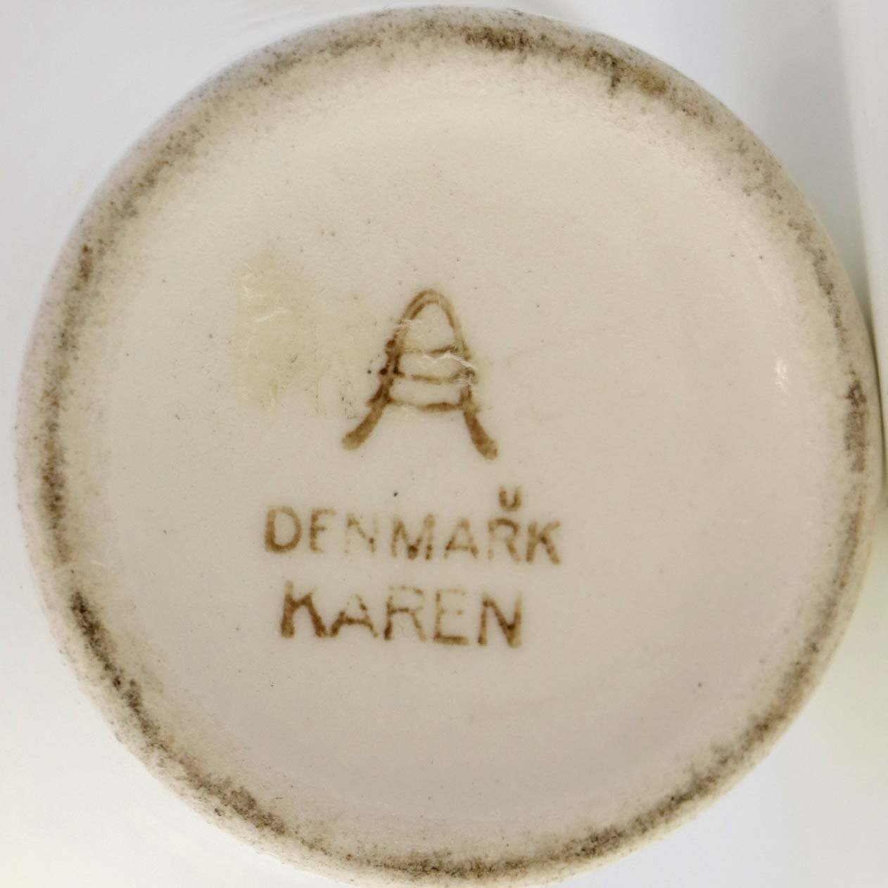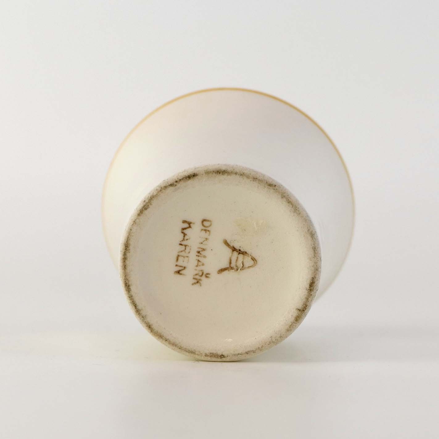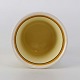 Glat fajancestel med dekoration i brune og gule farver på lys bagggrund med mørkebrun streg.