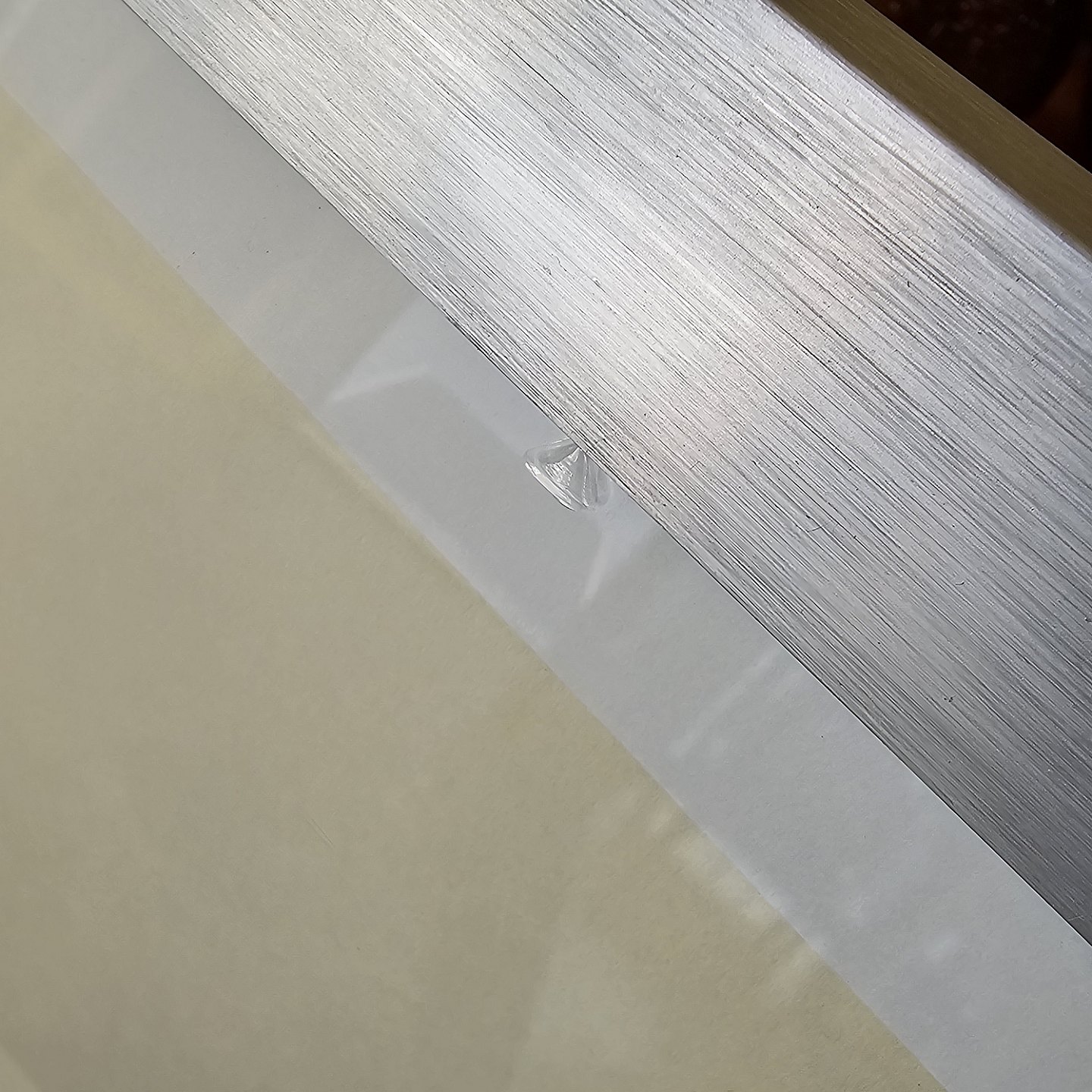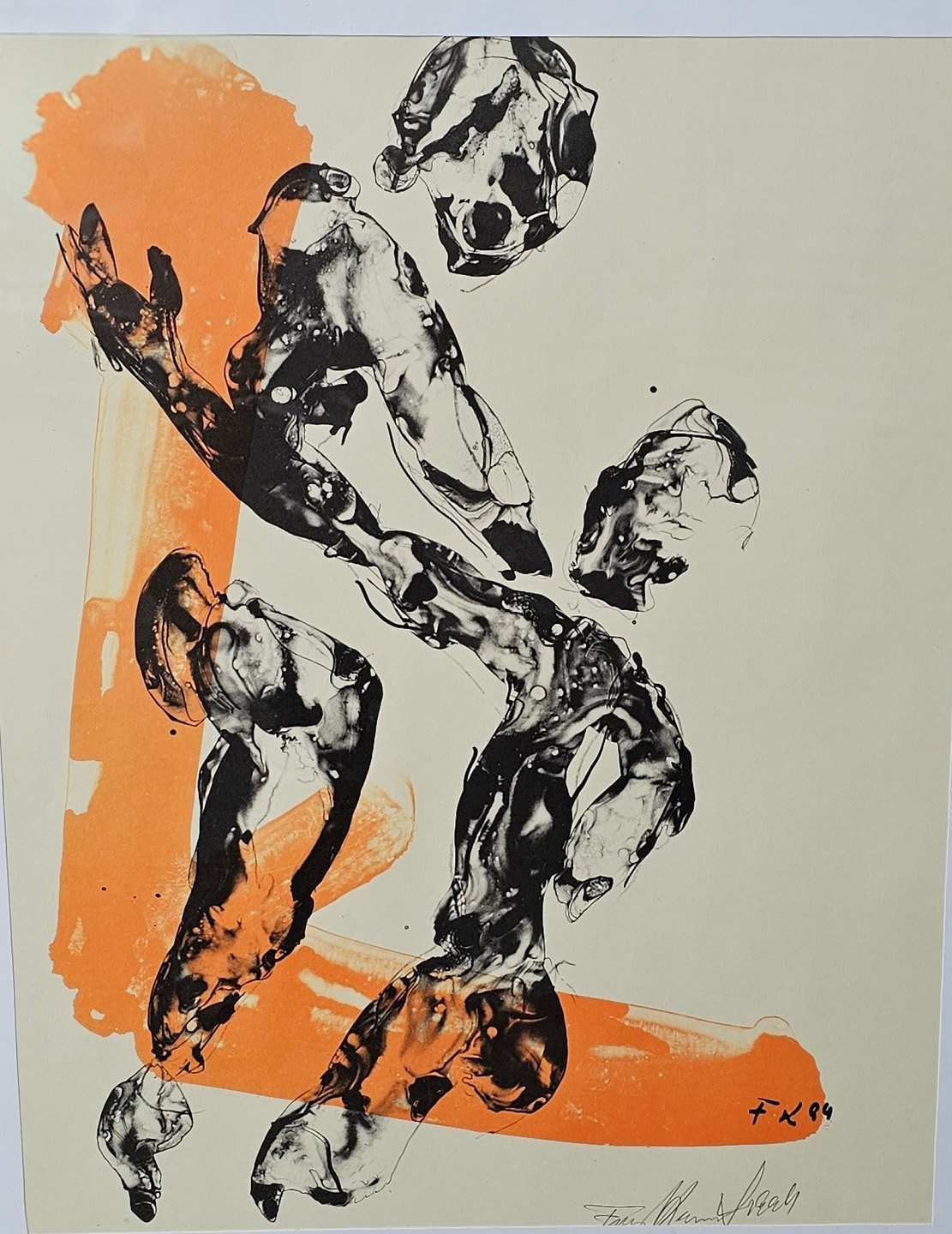 Akvaral på papir med abstrakt motiv af to mennesker i sort og gul. Monteret i sølvramme