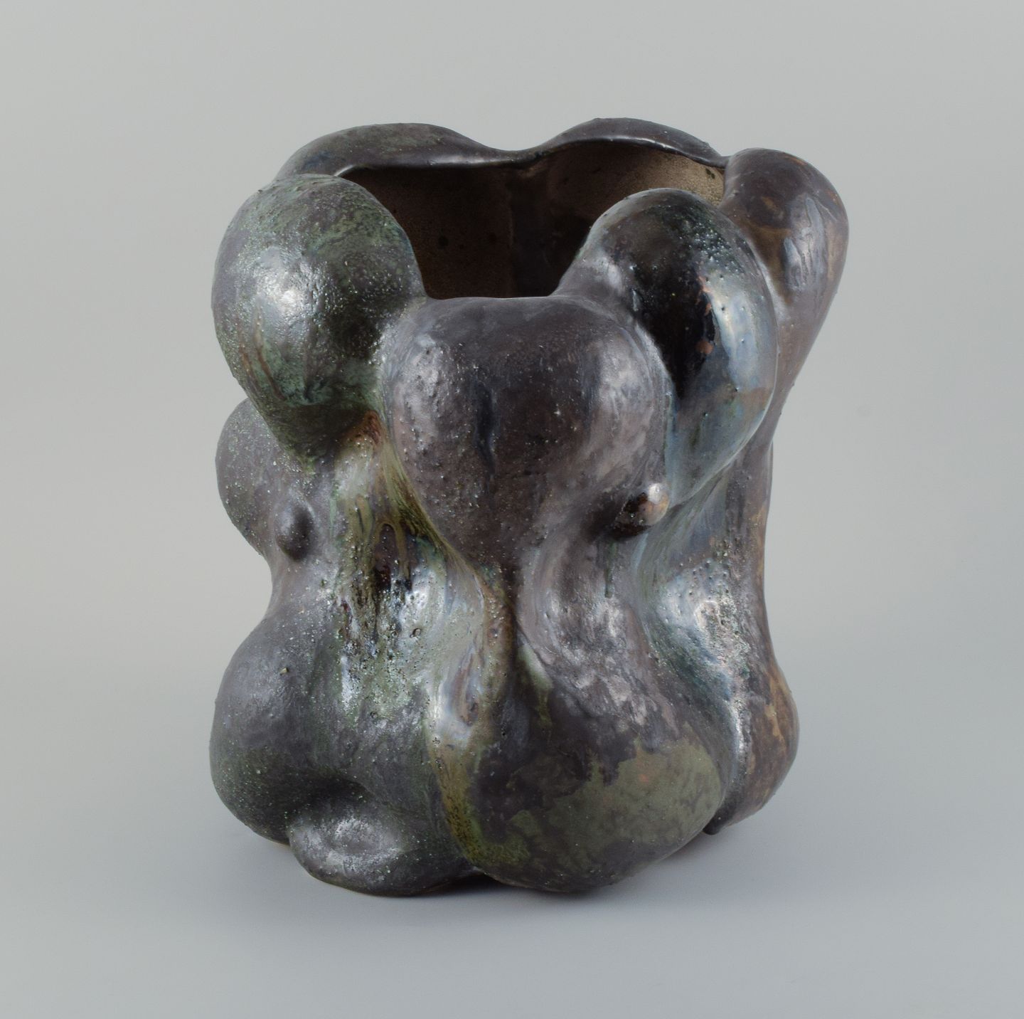 Monumental work in stoneware clay, covered in blackish green glaze with the occasional specks of blue on a semi-rough surface.