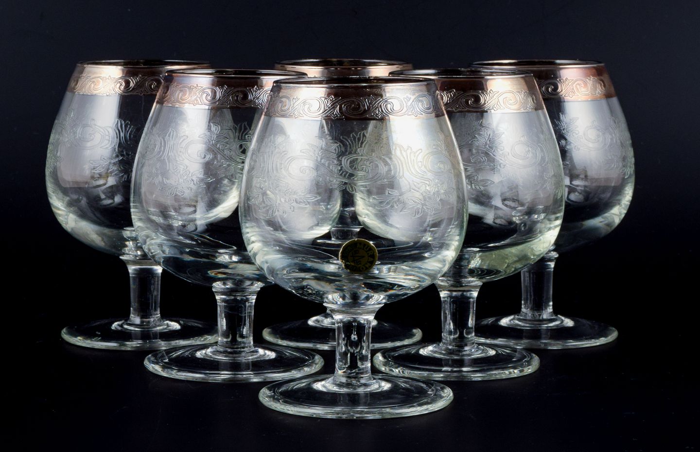 Murano, Italy, six mouth-blown and engraved brandy glasses with silver rim. Mid 20th century. In perfect condition. Sticker. Dimensions: H 11.0 x D 7.0 cm.