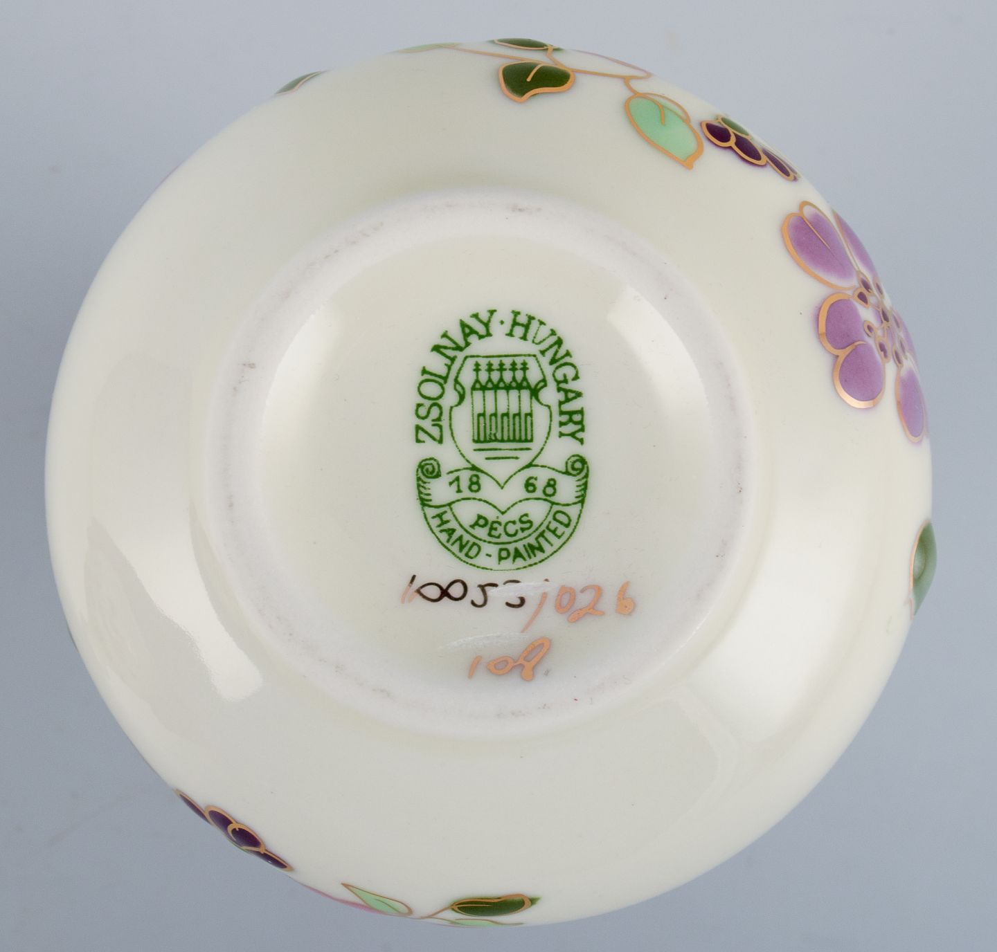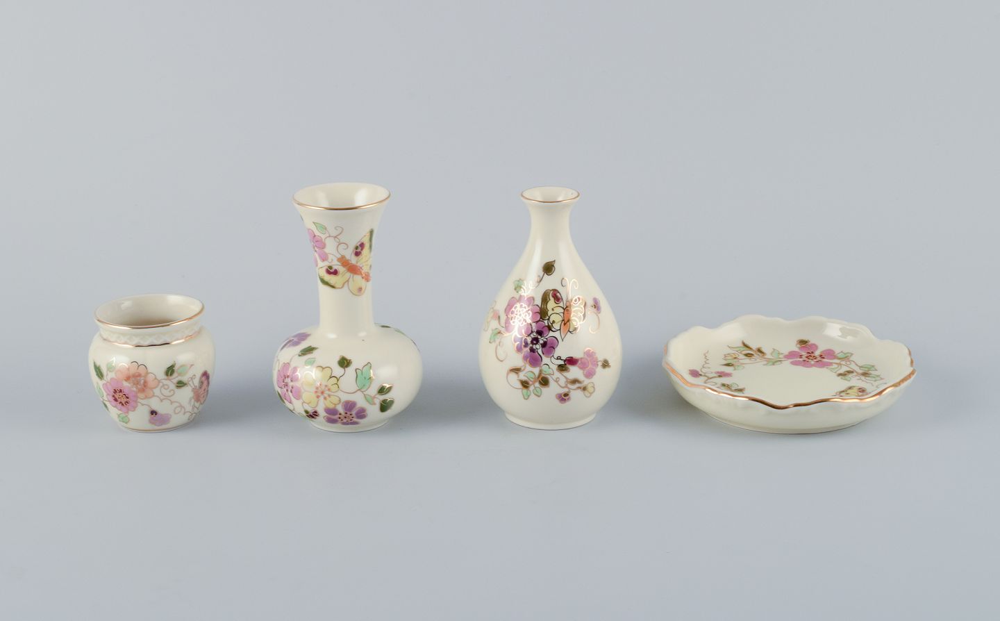 Zsolnay, Hungary, four-piece porcelain set consisting of three vases and a small dish. Hand-painted with flower motifs and insects on a cream-colored background.