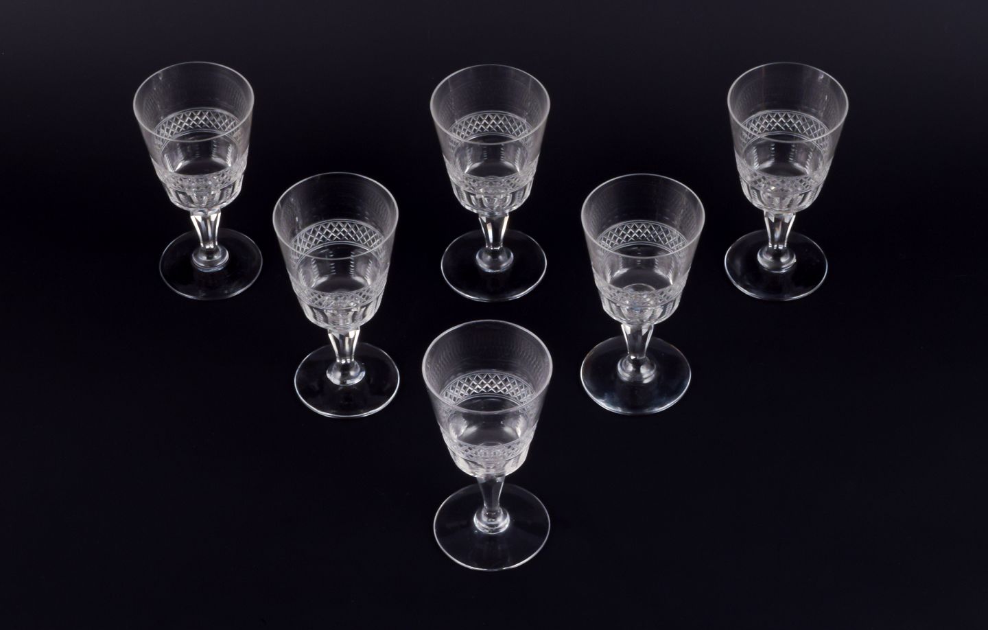 A set of six mouth-blown French white wine glasses in crystal glass. Faceted cut.