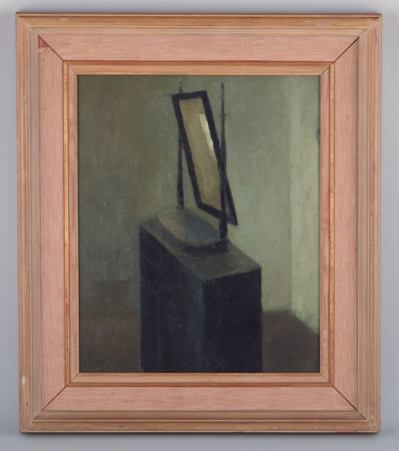 Lars Vidlund, svensk kunstner, olie på plade. Modernistisk stilleben med vippespejl på sokkel. Mørke og afdæmpede toner.